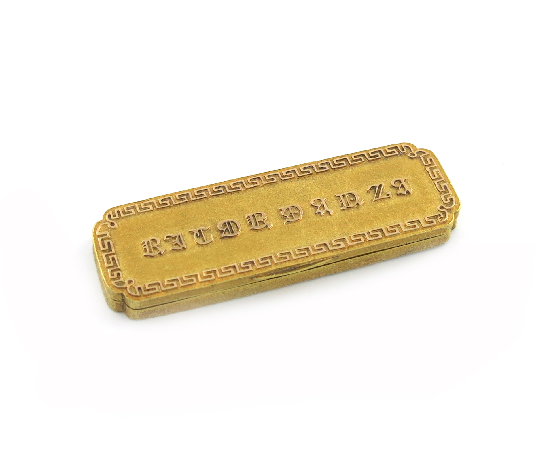 shaped rectangular form, the hinged cover applied 'RICORDANZA', (Souvenir), with a Greek Key border and matted decoration, length 7cm, approx. weight 39.3g.