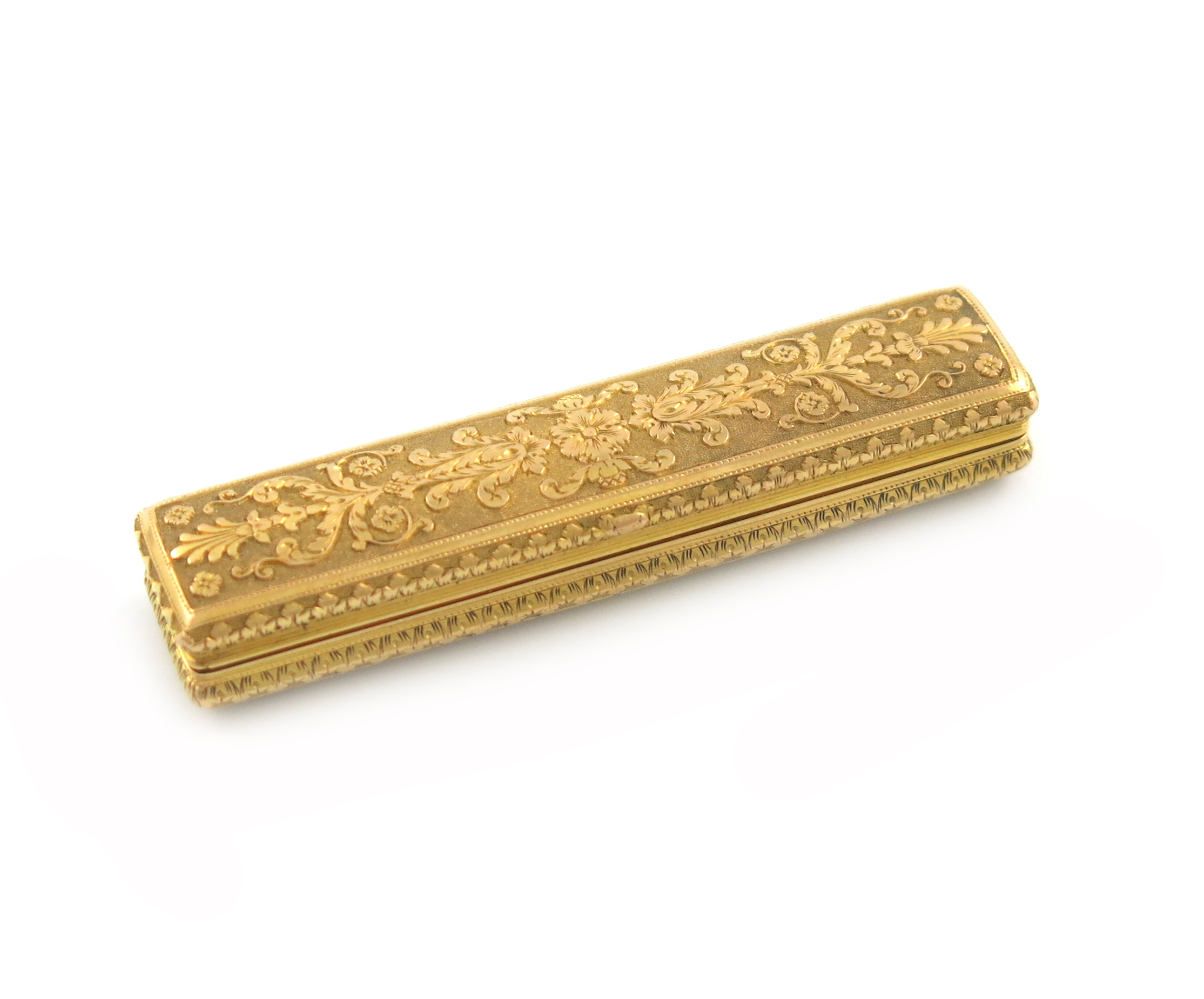 rectangular form, chased foliate decoration on a matted background, length 7.2cm, approx. weight 20.5g.