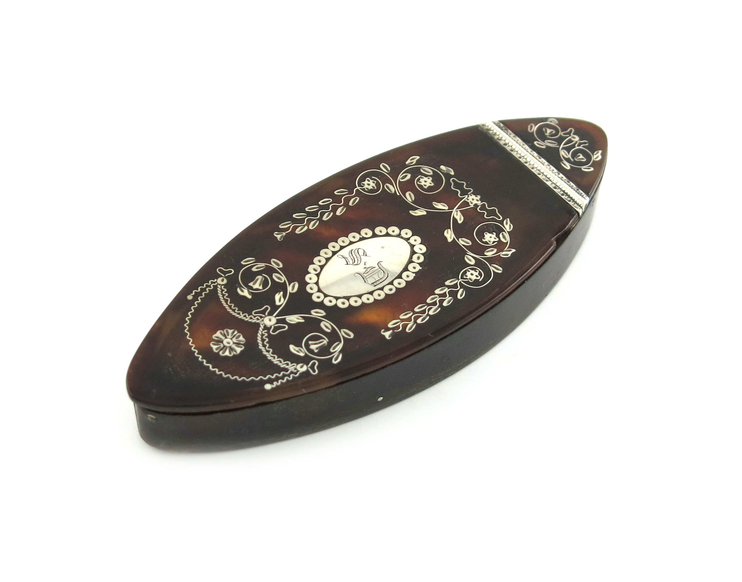 oval navette form, the hinged cover with inlaid decoration, and with an initialled oval cartouche, the hinged cover opens to reveal a hinged compartment, mirror with a crack, length 9.8cm.