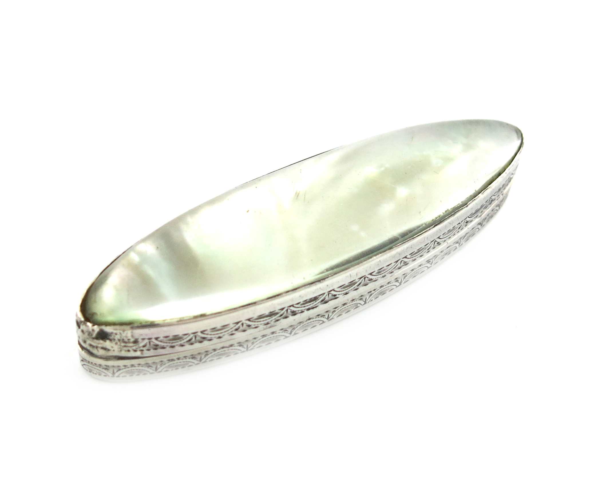 oval navette form, the sides with engraved decoration, mother-of -pearl base and cover, the cover mounted with a domed glass magnifying cover, length 7.5cm.