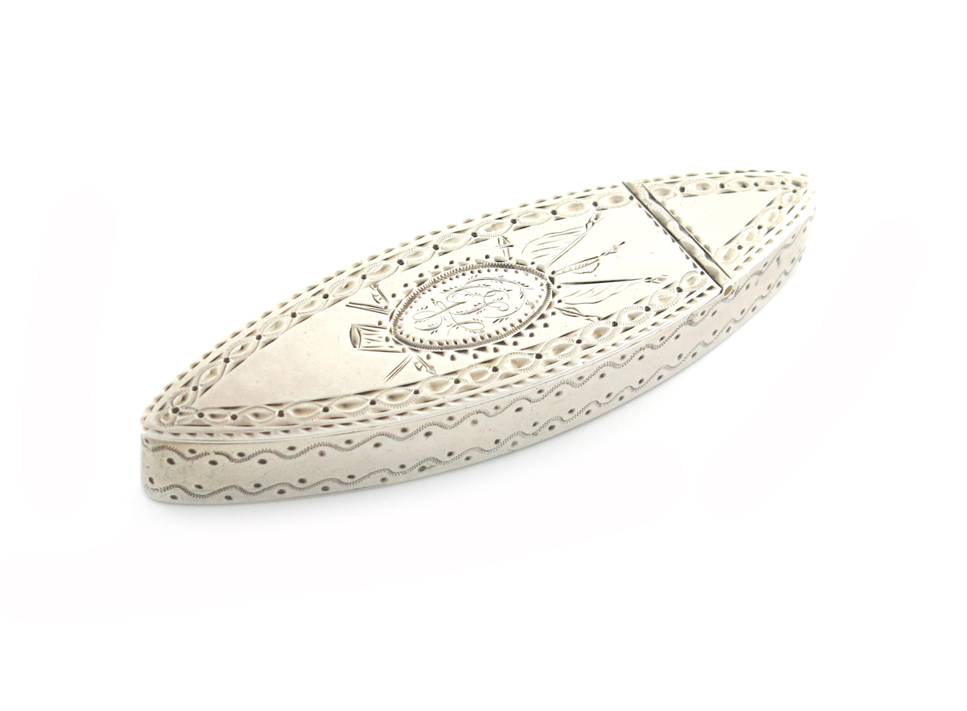oval navette form, bright-cut decoration, the hinged cover with flags and initials, the base engraved with a violin and bow, the hinged cover with a mirror, length 7.9cm, approx. weight 0.9oz.