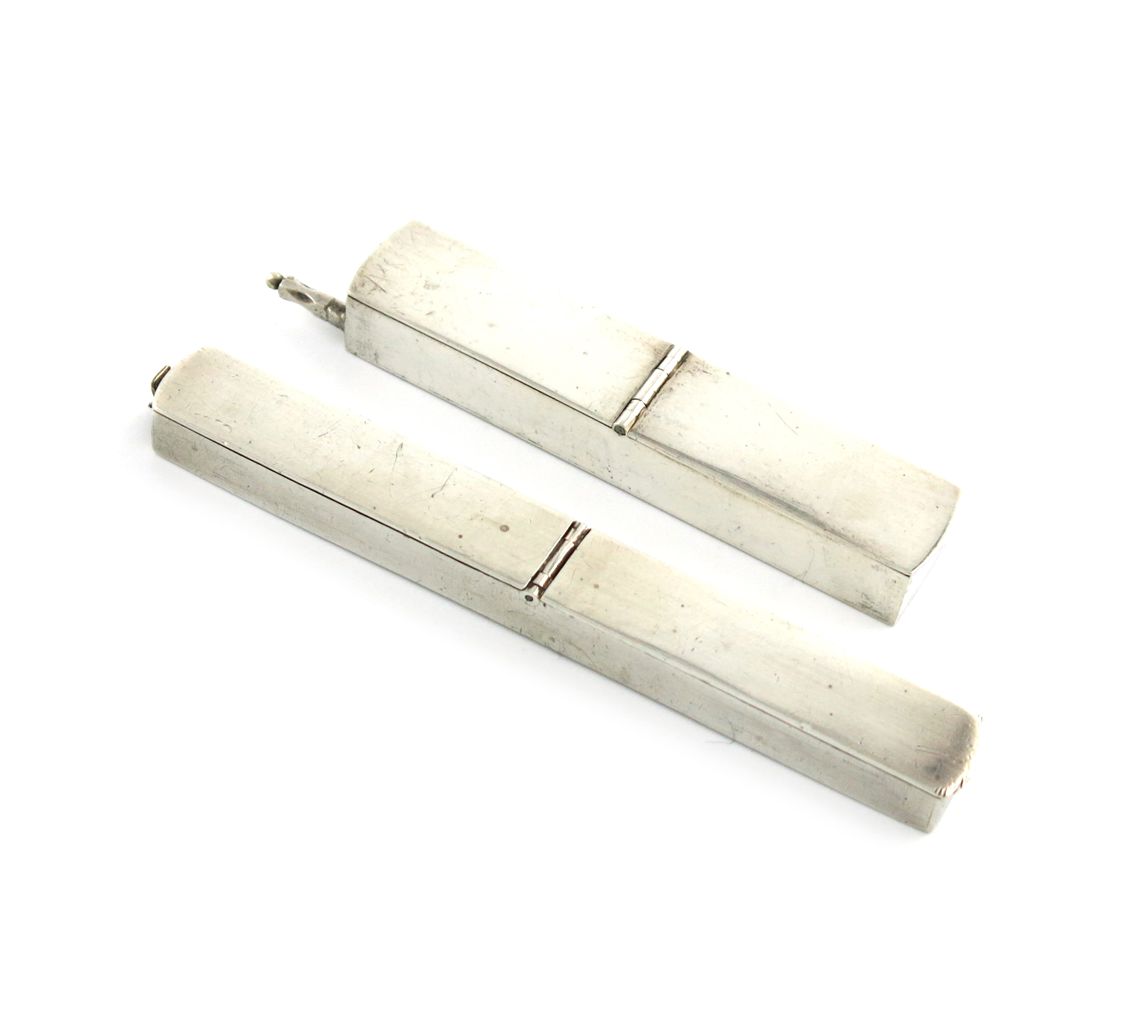 rectangular form, with two compartments and plain hinged covers, plus an early 19th century French silver dental powder box of rectangular form, lengths 9.4cm and 7.8cm, approx. weight 1.5oz. (2)