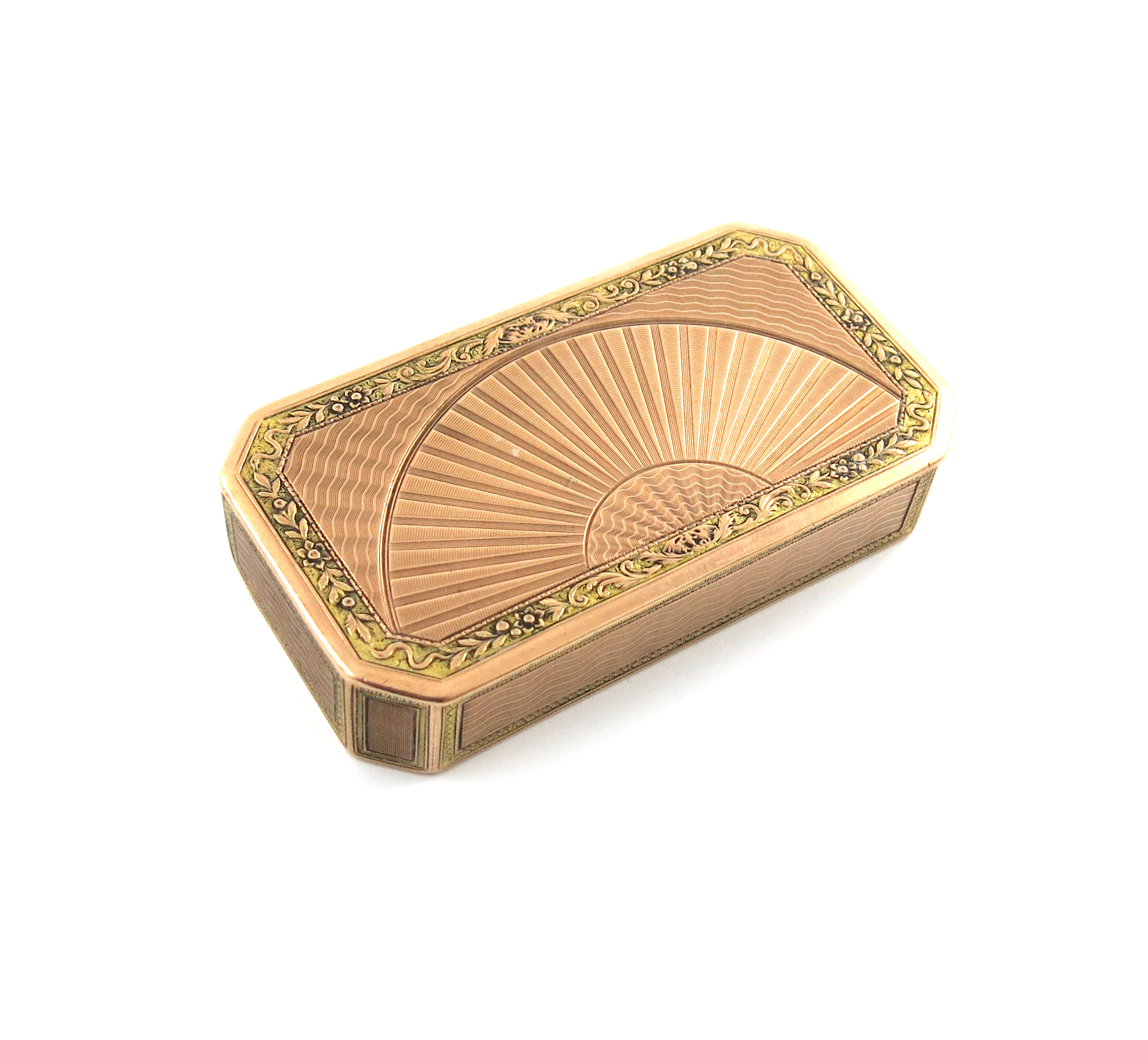 rectangular form, canted corners, the cover and base with radiating fan decoration, vari-coloured foliate and snake border, length 8.8cm, approx. weight 87.6g.