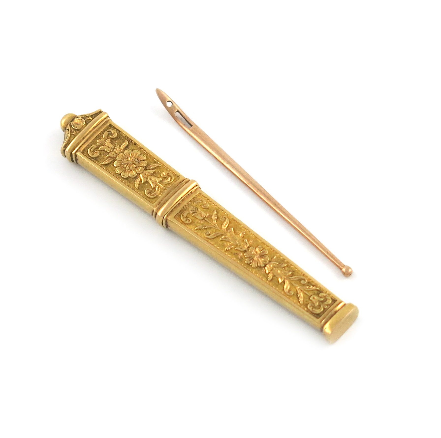 tapering rectangular form, chased foliate decoration on a matted background, plus a gold bodkin, length 7.2cm, approx. weight 6.7g. (2)