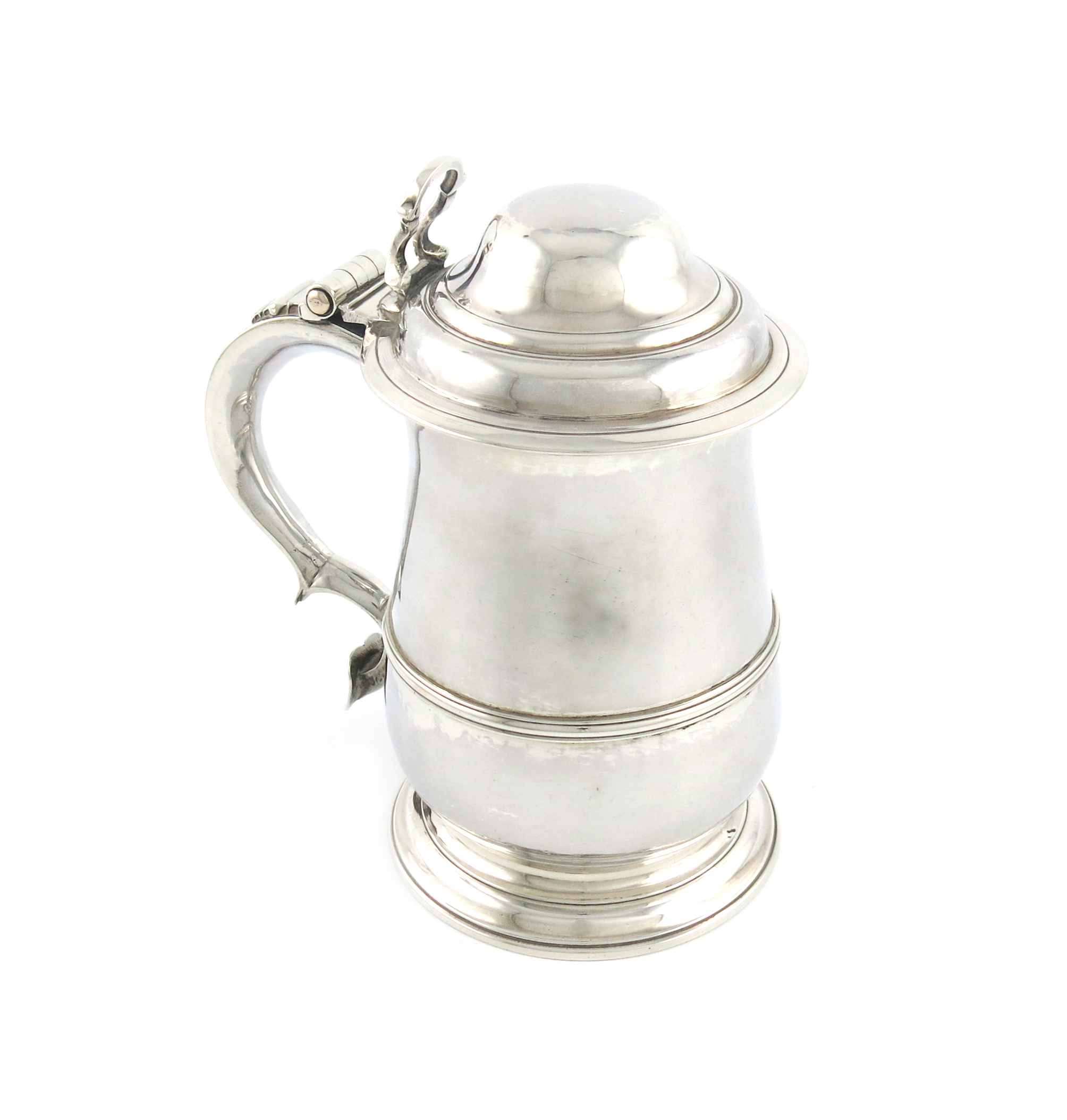 tapering baluster form, central girdle, scroll handle, domed hinged cover with a pierced thumb-piece, the scroll handle scratch initialled 'C' over 'T*A', on a circular foot, height 19.3cm, approx. weight 24.9oz.