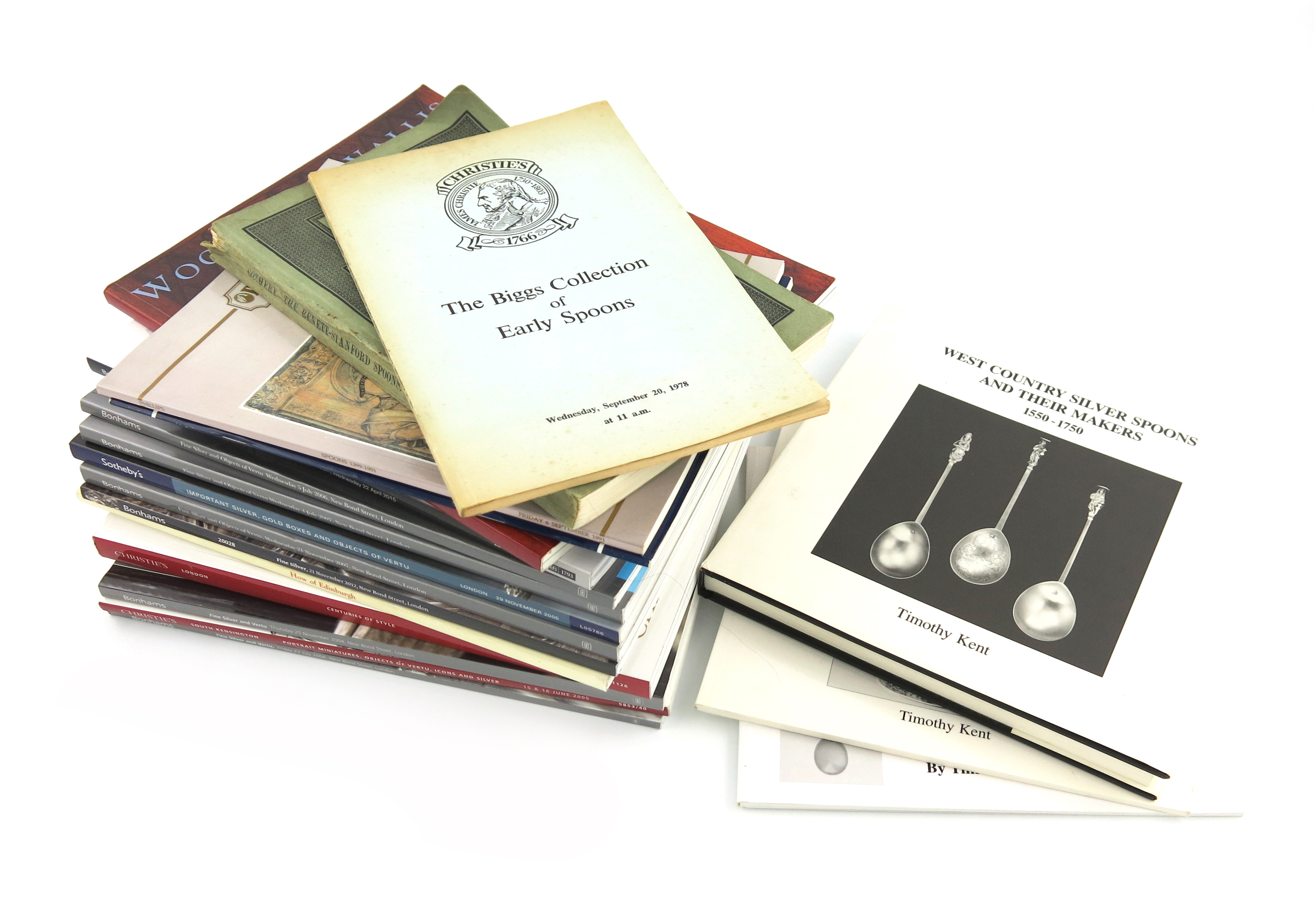 including: Kent, T., West Country Silver Spoons and Their Makers, Sussex Silver and its Makers, and Barnstaple Silver and Its Makers, The Ellis Collection, Sotheby and Co, 1935, Th Biggs Collection, Christie's 1978, and other catalogues. (qty)