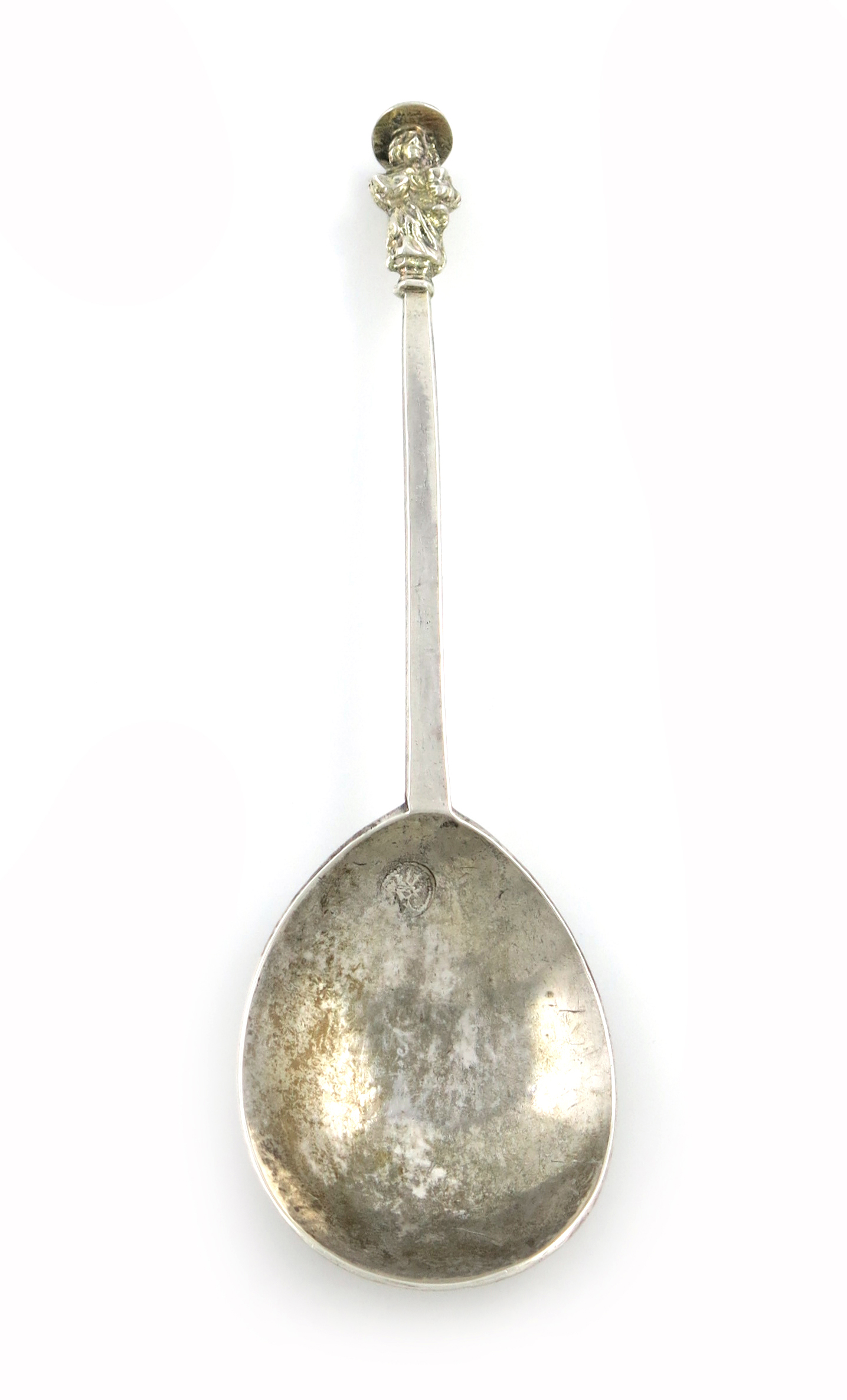 fig-shaped bowl, the reverse prick-dot initialled 'E.H' over 'R.W' '1661', tapering stem with a gilded Apostle finial, with a Holy Dove nimbus, length 19.1cm, weight 1.6oz.