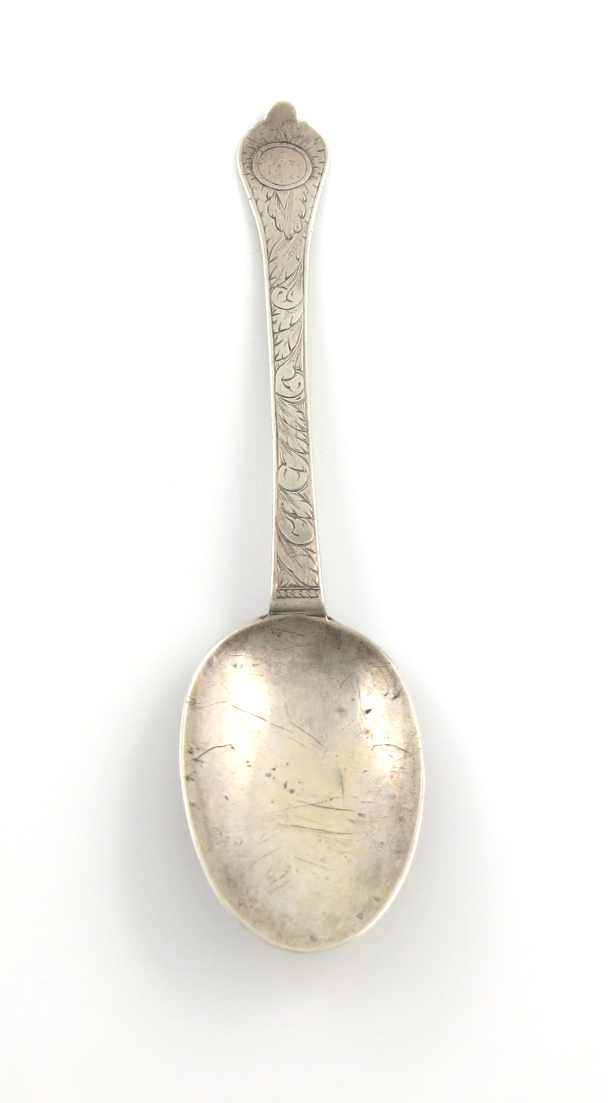 the oval bowl with a beaded rat-tail, the reverse of the terminal with scratch initials 'E.P' over 'T', length 17.5cm, approx. weight 0.9oz.
