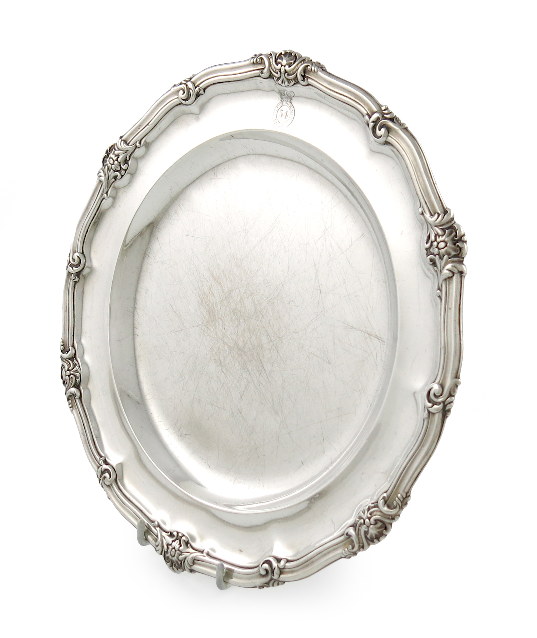 circular form, scroll and foliate motif border, engraved with the regimental badge of the 54th Regiment of Foot, the reverse numbered '71', diameter 25.5cm, approx. weight 18.2oz. (1)