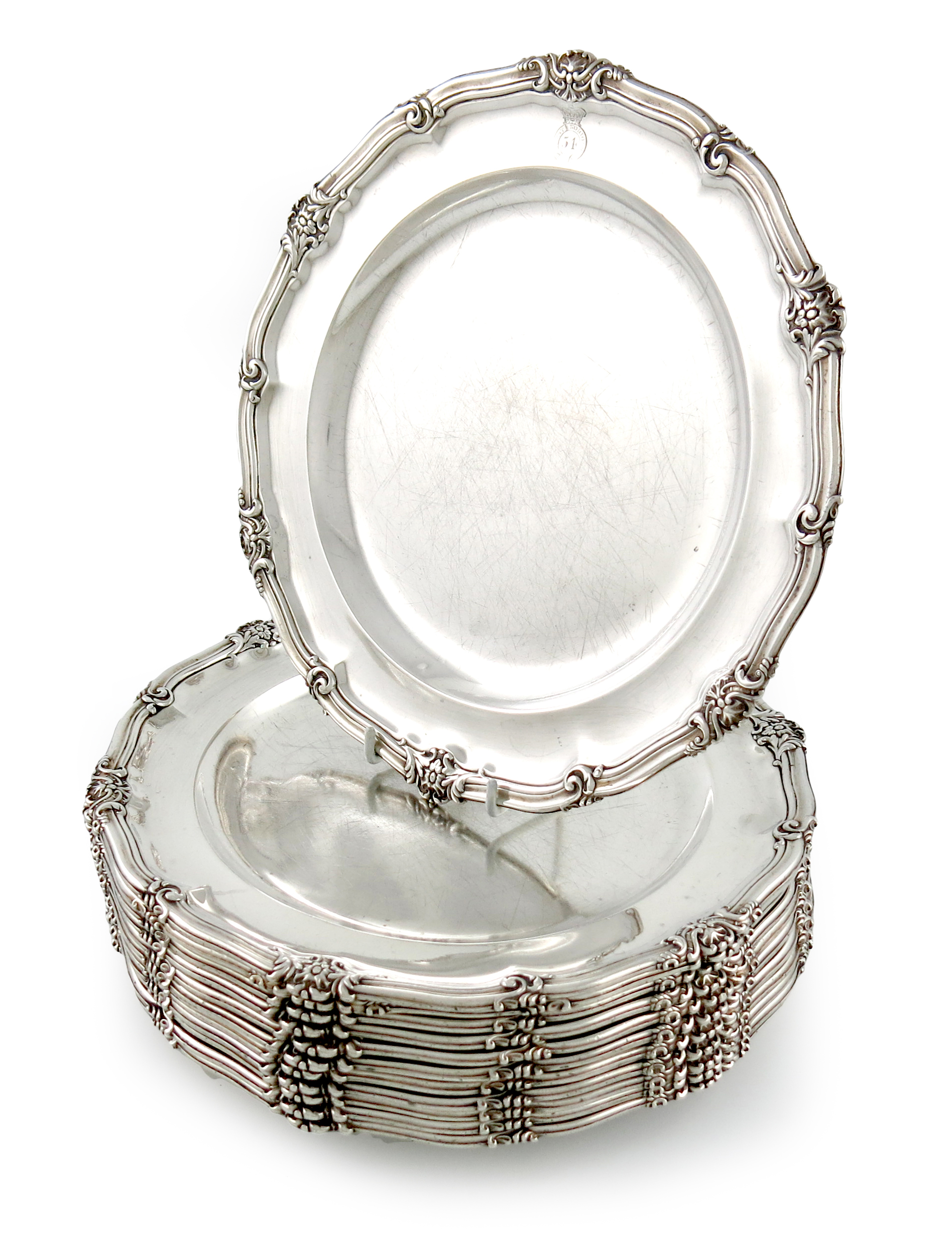 circular form, scroll and foliate motif border, engraved with the regimental badge of the 54th Regiment of Foot, the reverses numbered '25, 26, 27, 28, 30, 31, 32, 33, 35, 36, 37, 38', diameter 25.5cm, approx. weight 219.8oz. (12)