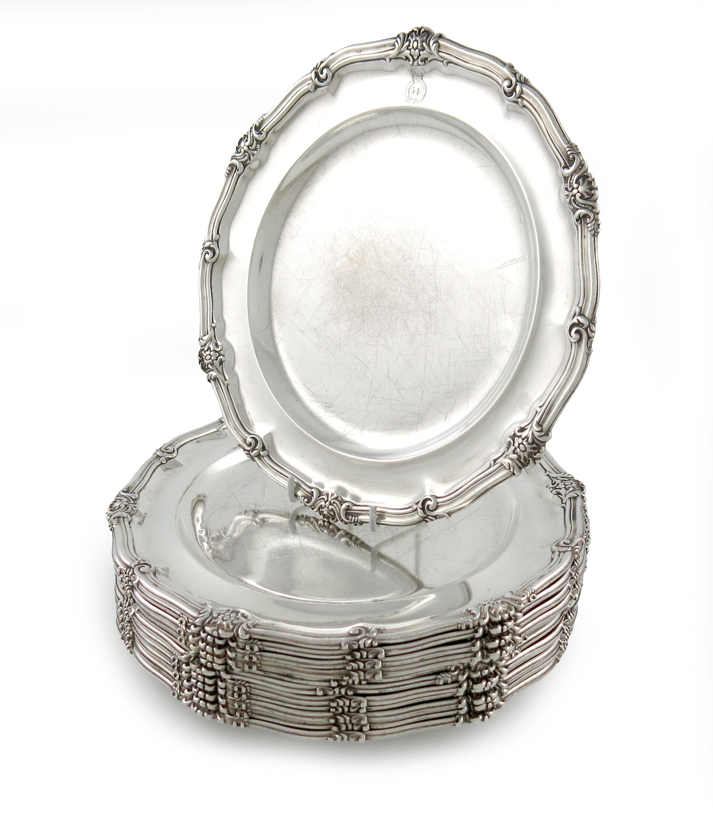 circular form, scroll and foliate motif border, engraved with the regimental badge of the 54th Regiment of Foot, the reverses numbered '55, 56, 59, 60, 61, 63, 64, 65, 66, 67, 68, 70', diameter 25.5cm, approx. weight 223oz. (12)