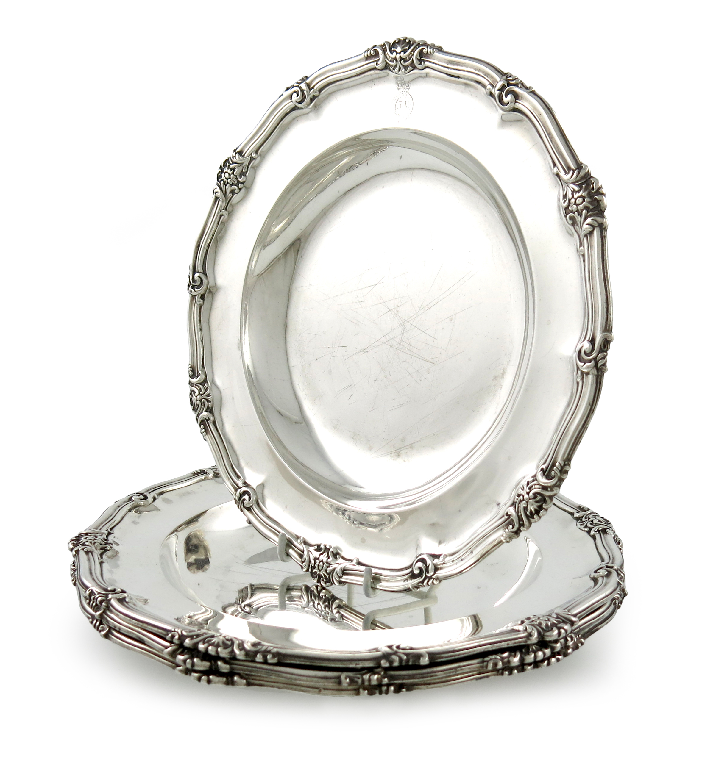 circular form, scroll and foliate motif border, engraved with the regimental badge of the 54th Regiment of Foot, the reverses numbered ' 25, 26, 27, 30', diameter 25.5cm, approx. weight 80.7oz. (4)