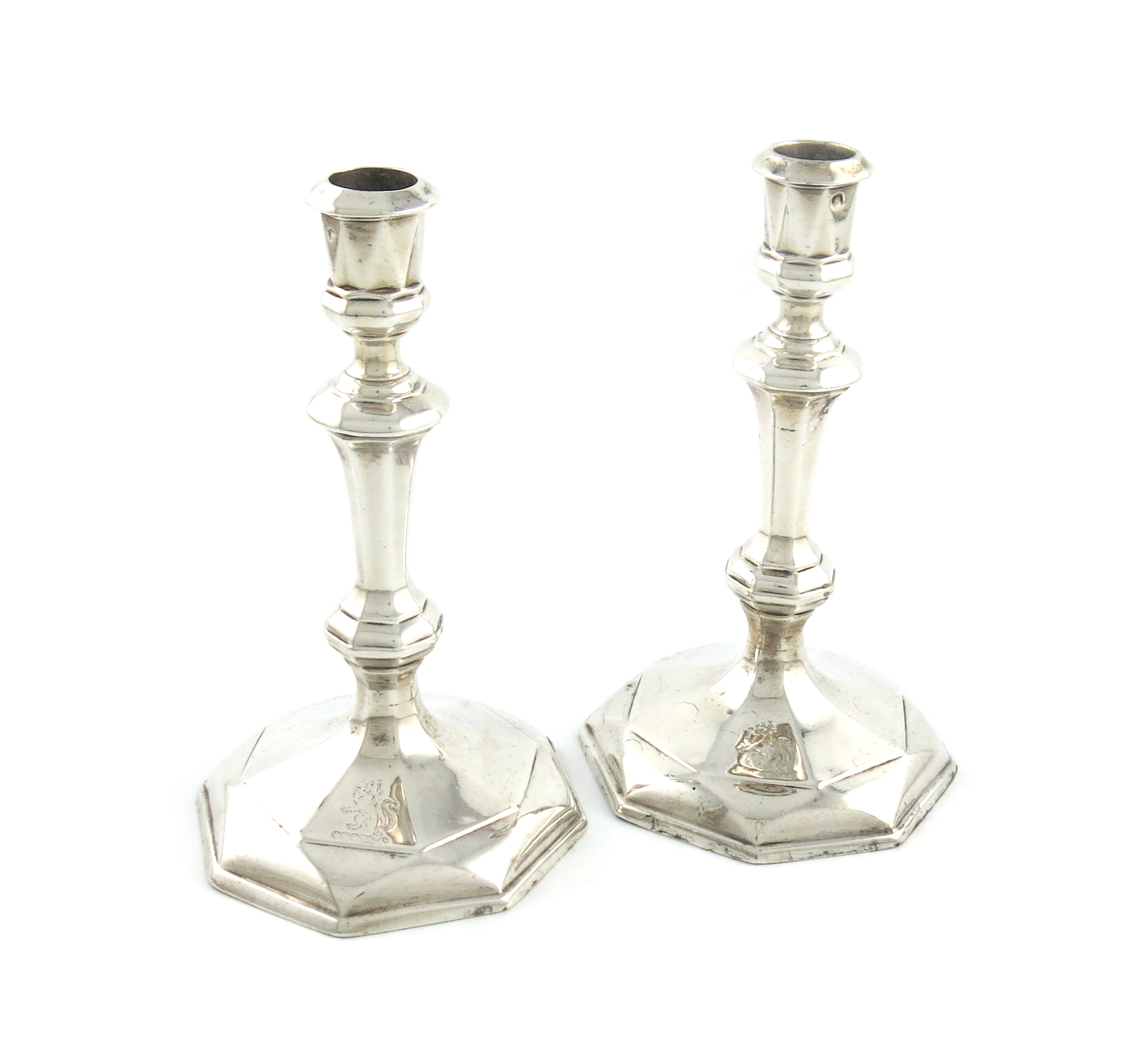 octagonal baluster stems, spool shaped capitals, on raised octagonal bases, engraved with a crest, height 18.5cm, approx. weight 24.5oz. (2)