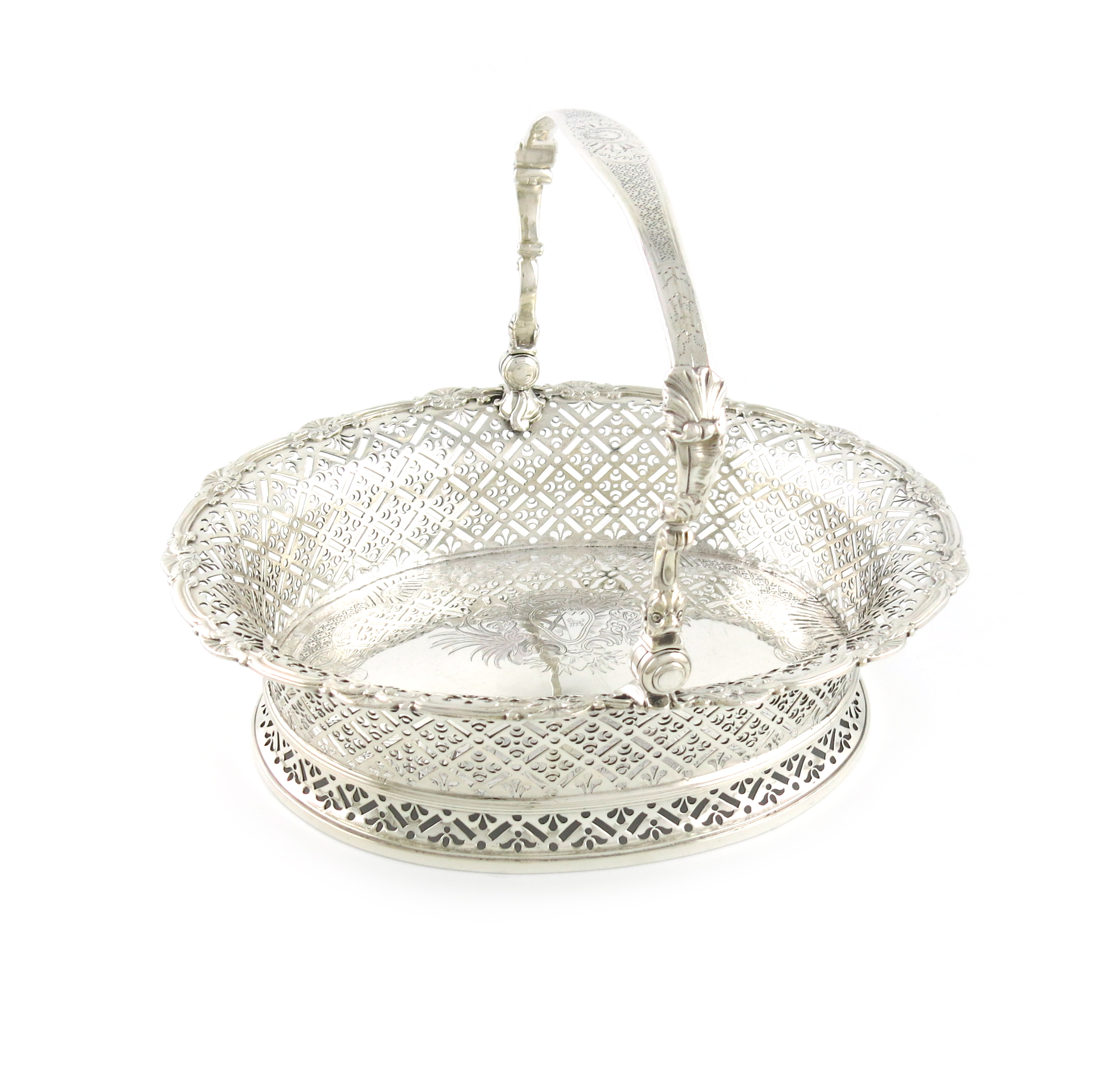oval form, pierced decoration, shell and scroll border, the swing-handle with masks, shells and chased decoration, the centre with an armorial within foliate mantling, on a raised pierced oval foot, length 31cm, approx. weight 50.8oz.