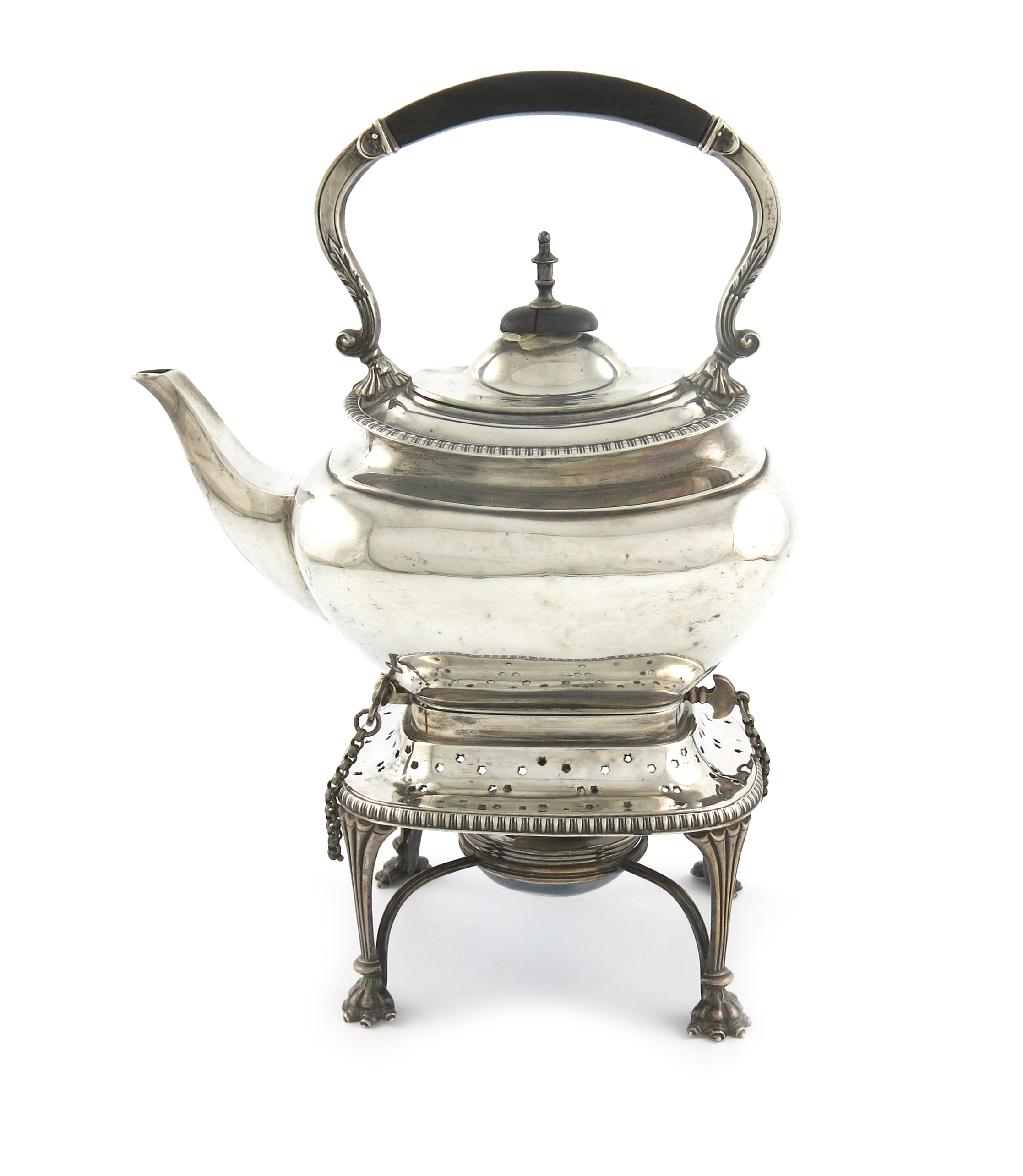 rounded rectangular form, central carrying handle, gadroon borders, stand of rounded rectangular form, on four fluted legs with paw feet, with a burner, height 28.5cm, approx. weight 34.7oz.