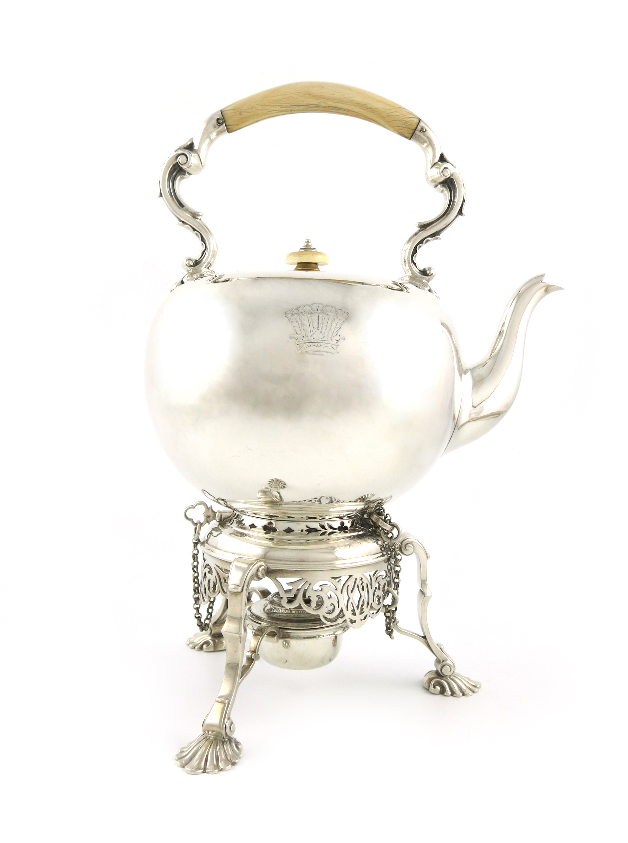 plain bullet form, central scroll and ivory handle, flush-hinged cover with an ivory finial, the stand of circular form, pierced apron with a burner, on three shell feet, engraved with a crest, height 36cm, approx. weight 52oz.