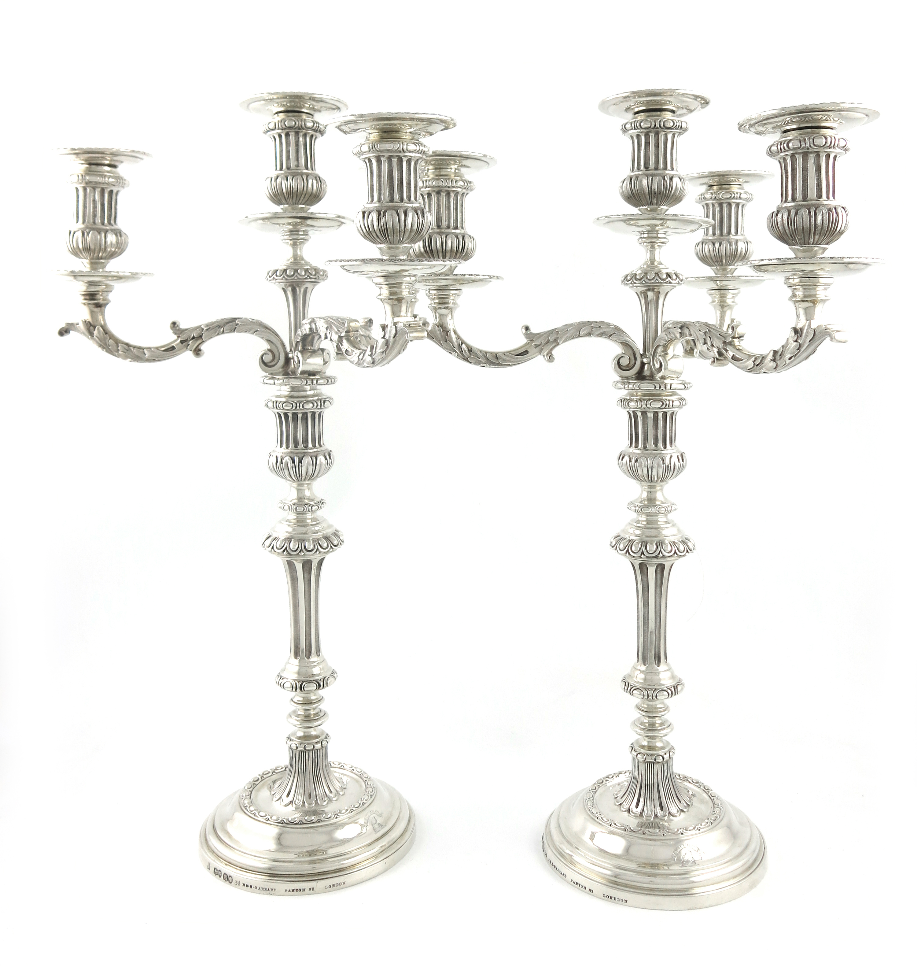 fluted knopped stems with a central fluted urn capital, with three leaf capped scroll arms each supporting an urn capital, on raised circular bases, inscribed 'R and S Garrard, Panton Street, London', engraved with a crest, height 49cm, approx. weight 183oz. (2)