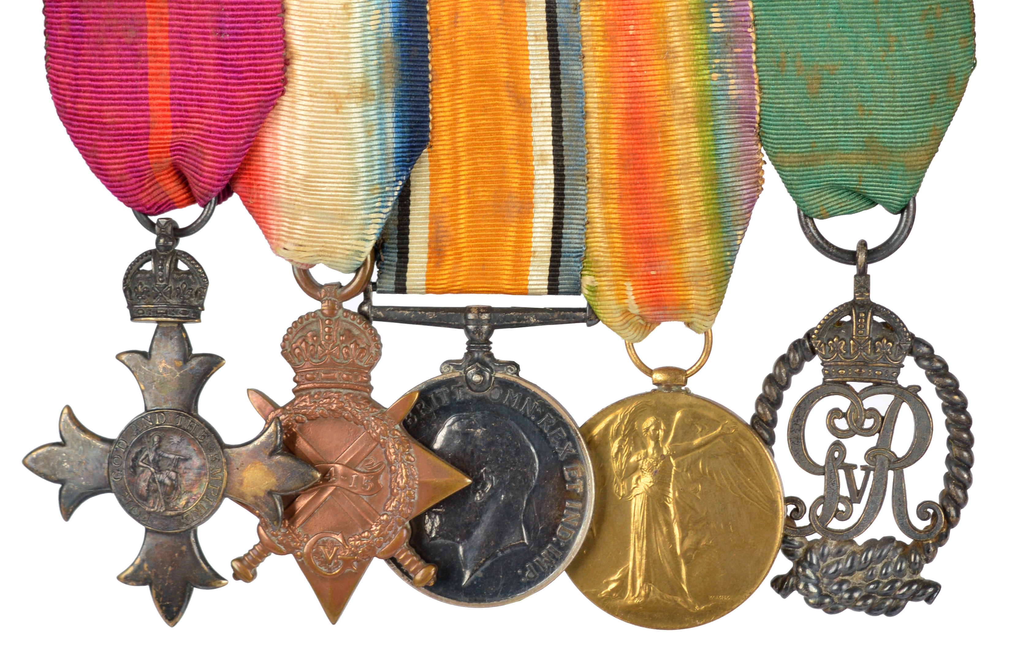 The O.B.E. group of five medals to Lieutenant Commander Harold D. Watts-Russell, O.B.E., R.D. Royal Naval Reserve: The Most Excellent Order of the British Empire, Officer's breast badge (military), Britannia type; 1914-15 Star, British War and Victory Medals (LT. COMMR. H.D. WATTS-RUSSELL. R.N.R.); Royal Naval Reserve Decoration, George V; mounted for wearing and preserved in a Gieves Ltd. case; with associated mounted dress miniatures, at least very fine and with original ribbons.