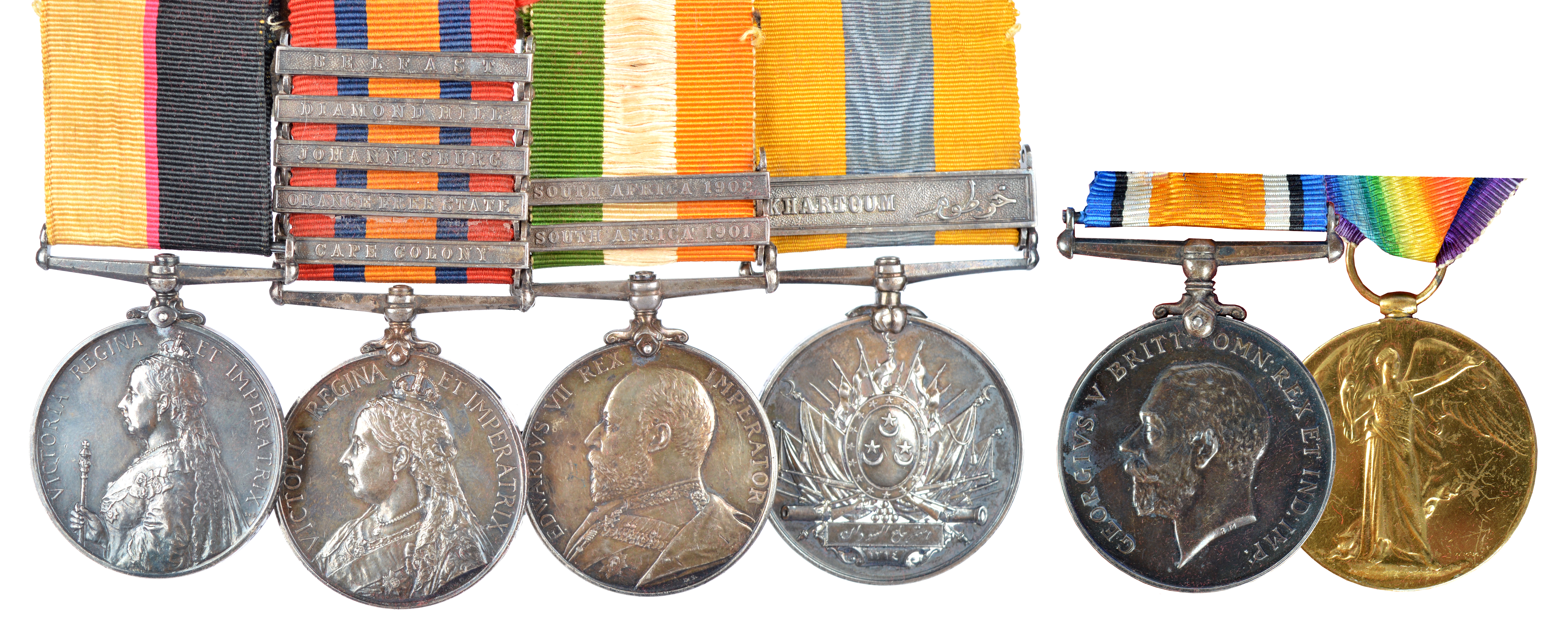 The Battle of Omdurman group of six medals to Arthur Westwood, 21st Lancers, 6th (Inniskilling) Dragoons and Royal Horse Artillery: Queen's Sudan (3642 PTE A, WESTWOOD, 21/ LANCERS.); Queen's South Africa, first type (b) reverse, 5 clasps: Cape Colony, Orange Free State, Johannesburg, Diamond Hill, Belfast (4264. Pte. A. WESTWOOD. 6/Drgns), engraved; King's South Africa, both dated clasps (4264 PTE A. WESTWOOD. INNIS: DRGNS:); Khedive's Sudan, clasp: Khartoum (3642 PTE A. WESTWOOD 21ST LCRS), regimentally engraved; British War Medal 1914-20 and Victory Medal (614553 GNR. A. WESTWOOD. R.A.); the first four mounted for wearing, attractively toned and all extremely fine or very nearly so.