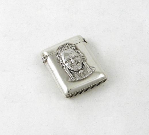Theatrical Interest: a late Victorian vesta case, with a relief portrait of "Charley's Aunt", the reverse inscribed "FROM CHARLEY'S AUNT DEC. 21ST 1895, gilt interior, by Walker & Hall, Sheffield 1895, 0.8oz.