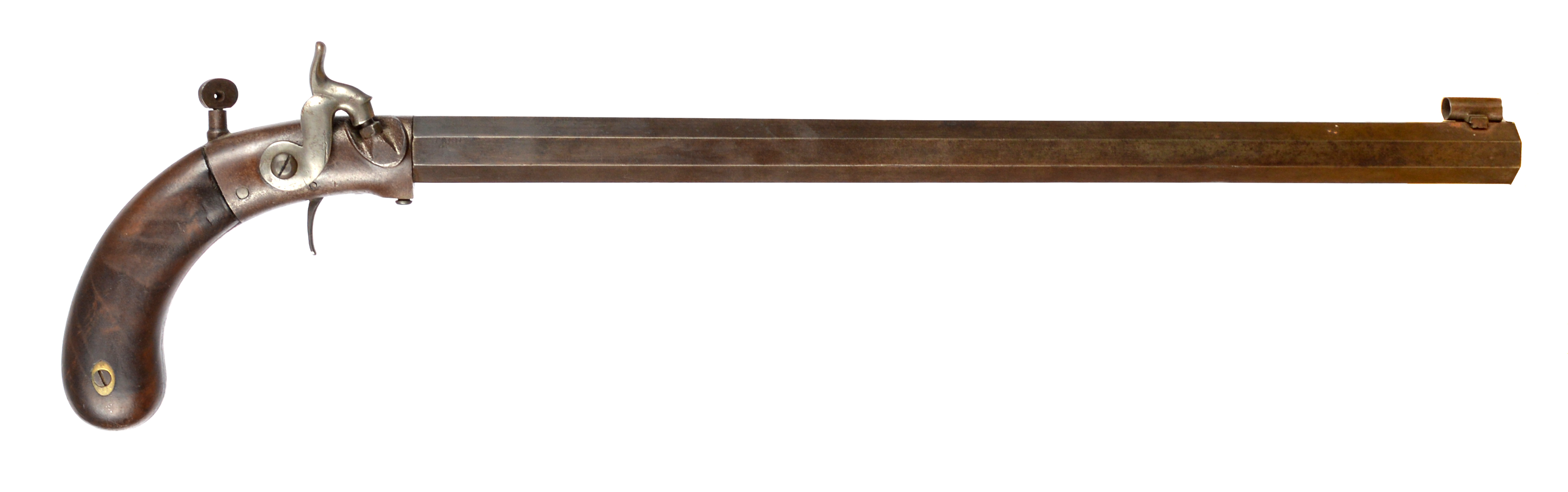 An American .30 calibre percussion target pistol, heavy octagonal barrel 16 in., clear and deep six-groove rifling, fine bead foresight to a dovetail mount with protective hood, steel side hammer action, aperture rear sight adjustable for elevation, wooden grips, steel ram rod retained by two pipes to the side of the barrel.