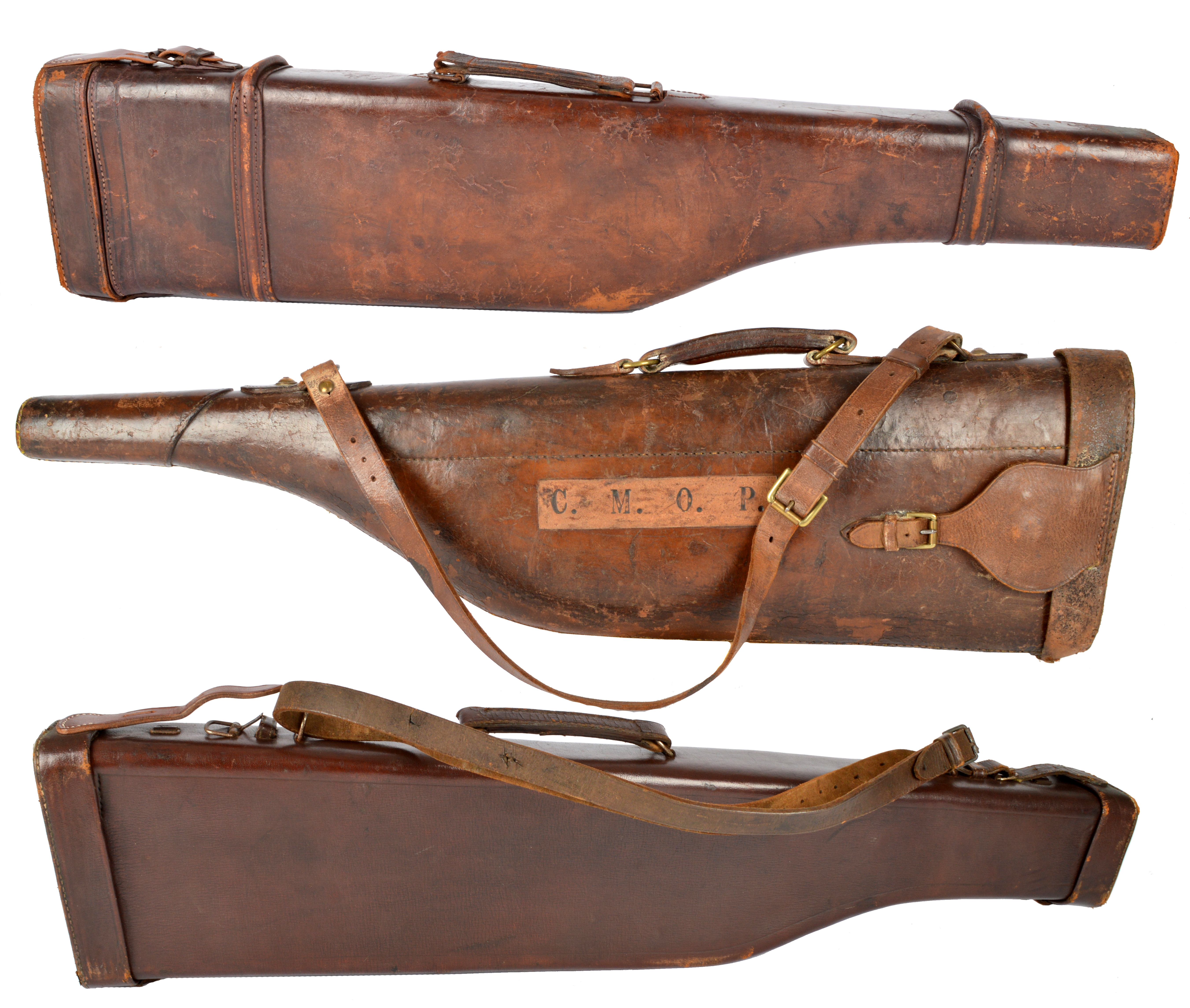 Three brown leather leg-o'-mutton gun cases, each with shoulder strap, handle and buckle closure, of varying ages. [3]
