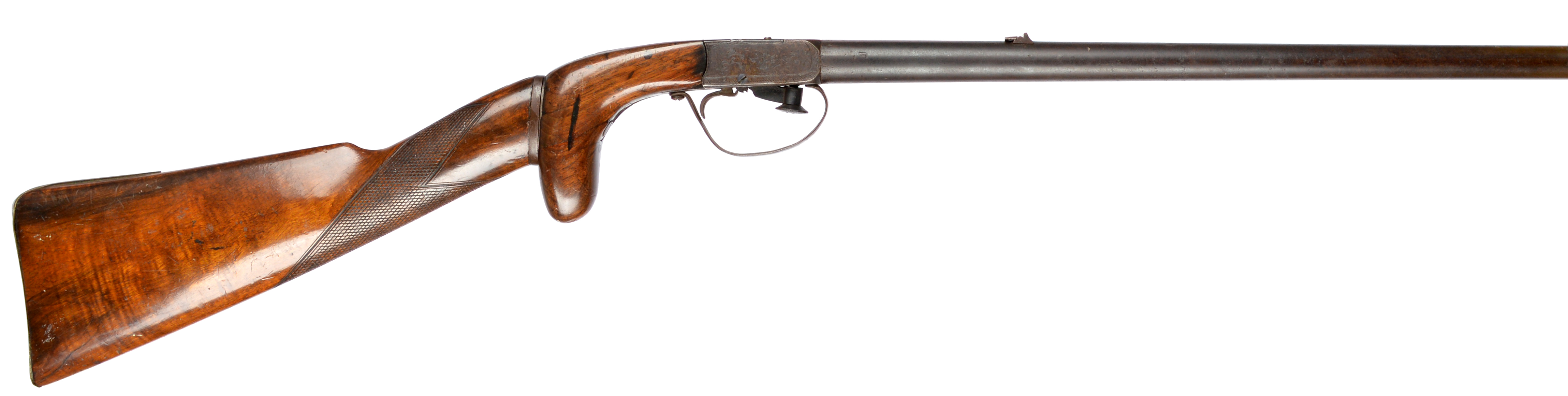 An English 54 calibre underhammer percussion rifle with 'takedown' butt, round barrel 28.5 in. with one standing and one folding leaf sight, seven groove rifling, Birmingham proofed, acanthus engraved action, the hammer drawn down by a knurled button, later trigger guard, wooden pistol grip, detachable butt (also later) with engraved brass plate.