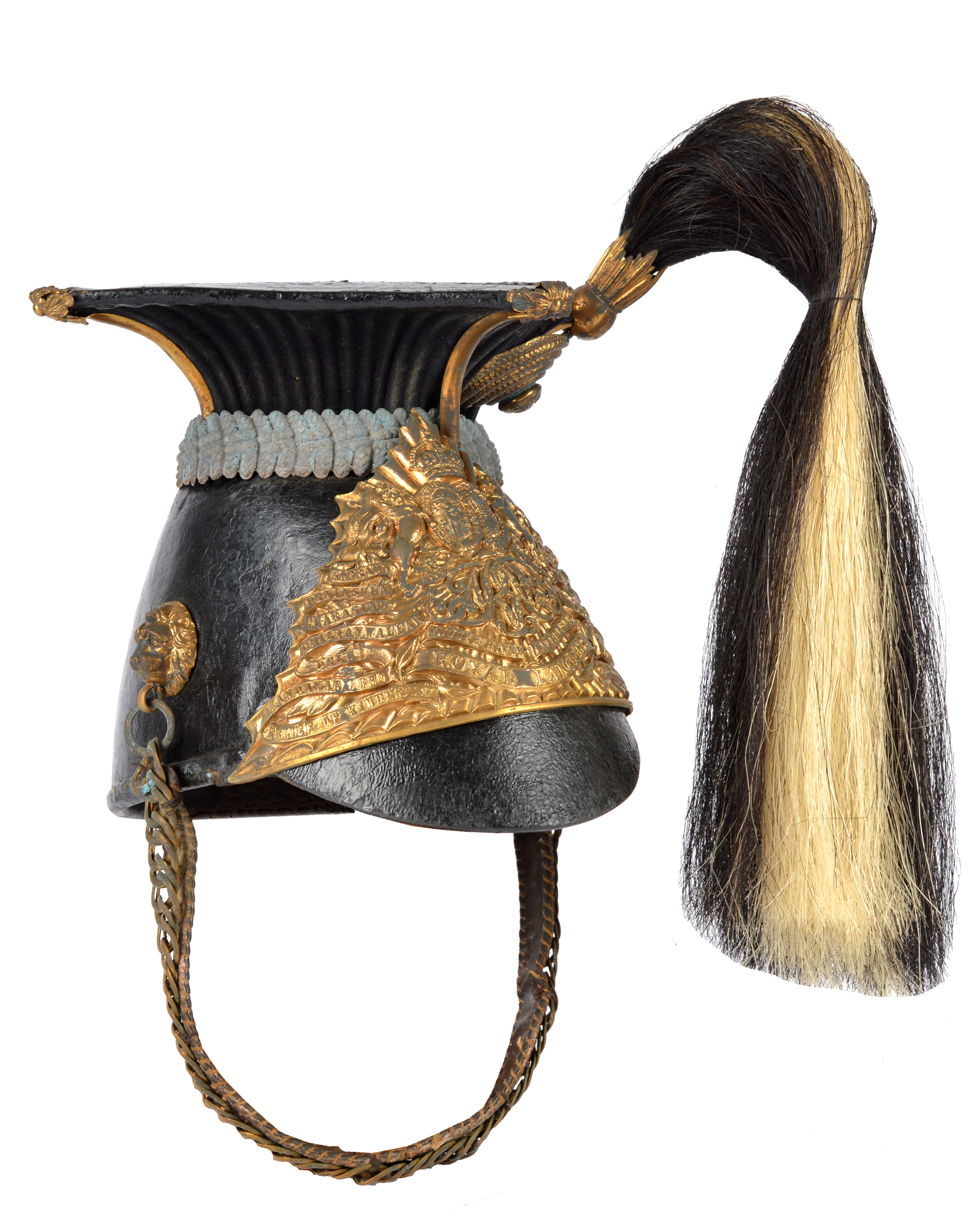 A post 1902 9th Lancers other ranks lance cap, patent leather skull with gilt helmet plate bearing regimental title and battle honours, chain chin strap suspended from gilt lion masks, square crest rising to the flat top with ribbed cloth sides and gilt acanthus corner mounts, blue cloth band, black and white horse hair plum to a gilt socket rising from a bullion cloth roundel; in a 20th Century glazed wooden display case.