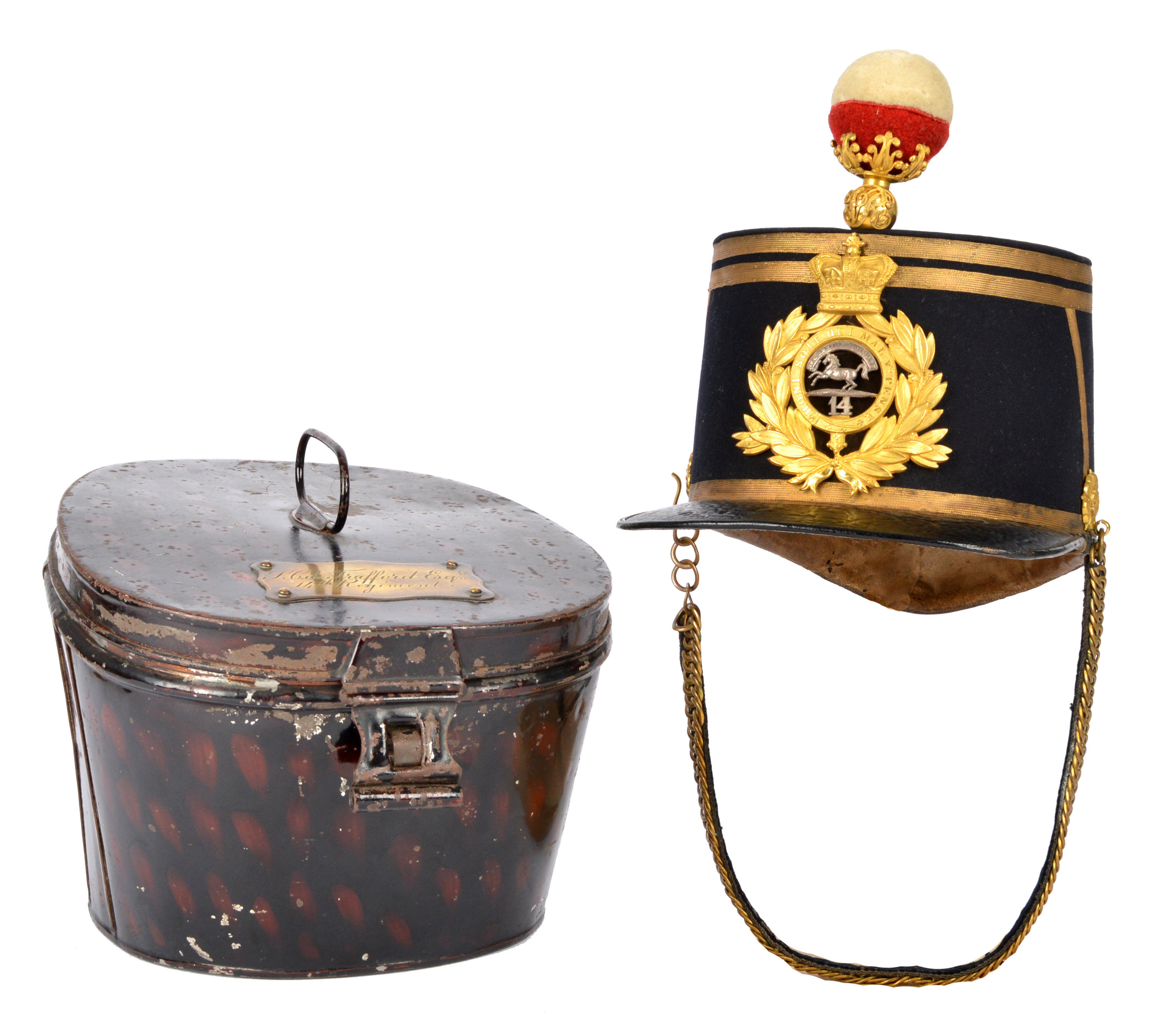 14th Regiment of Foot: an officer's shako, pattern of 1869-78, of dark blue cloth with patent leather peak, gilt plate with silver centre, gilt ball holder with VR cypher, red and white ball, quilted lining with taylor's name 'J. SKINNER & CO'; in its toleware box with brass plate to the lid engraved 'S.C.de Trafford Esq. / 14th Regiment'
