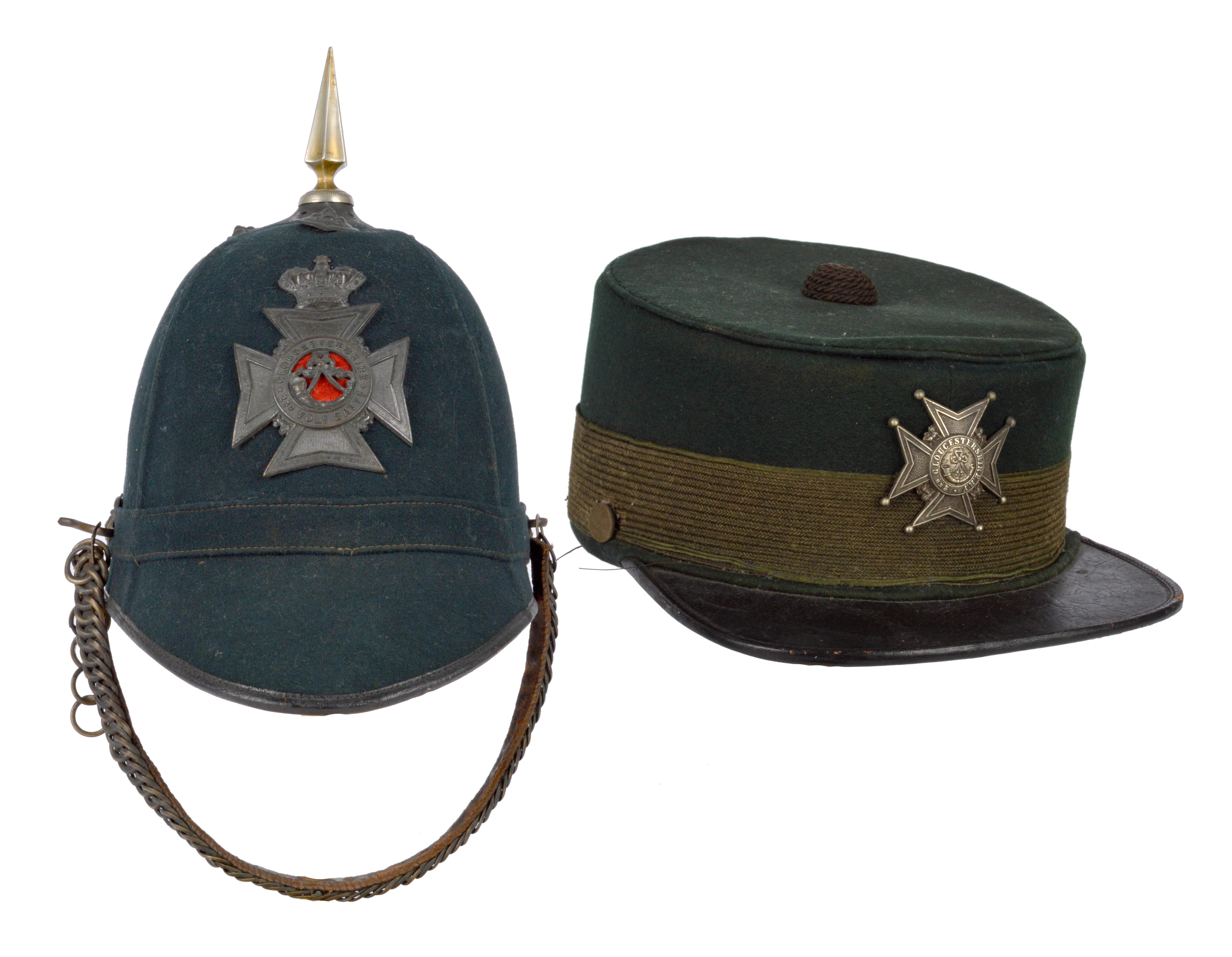 A 2nd Battalion Gloucestershire Rifle Volunteers other ranks home service cloth helmet, in dark green cloth with blackened metal helmet plate and fittings, associated spike; together with a 2nd Gloucestershire R.V. other ranks green cloth forage cap. [2]