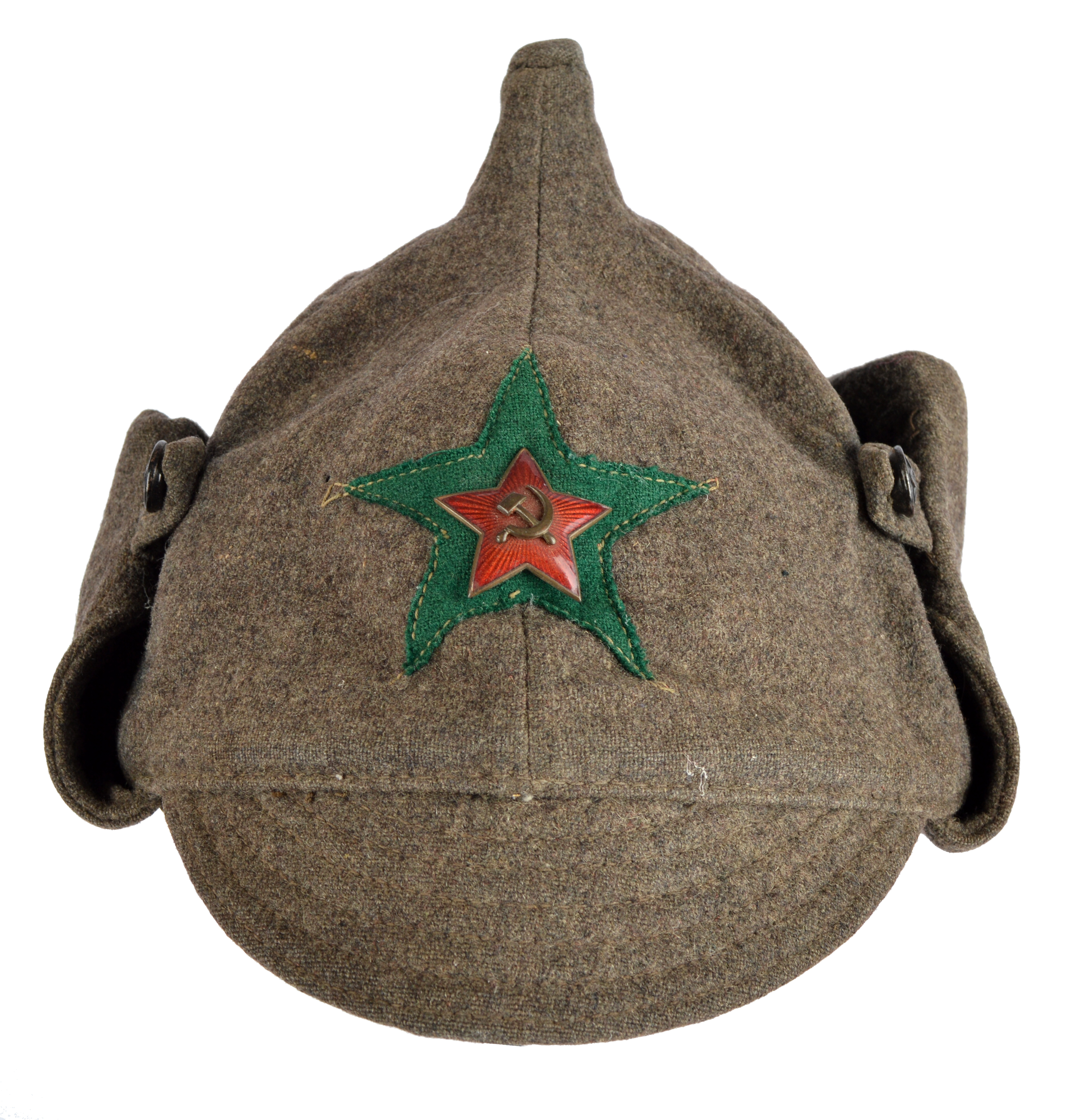 A Red Army budenovka (cap), grey-green wool with distinctive raised tip and buttoned ear flaps, quilted lining with faint markings, enamelled Soviet star badge fixed over a green cloth backing.