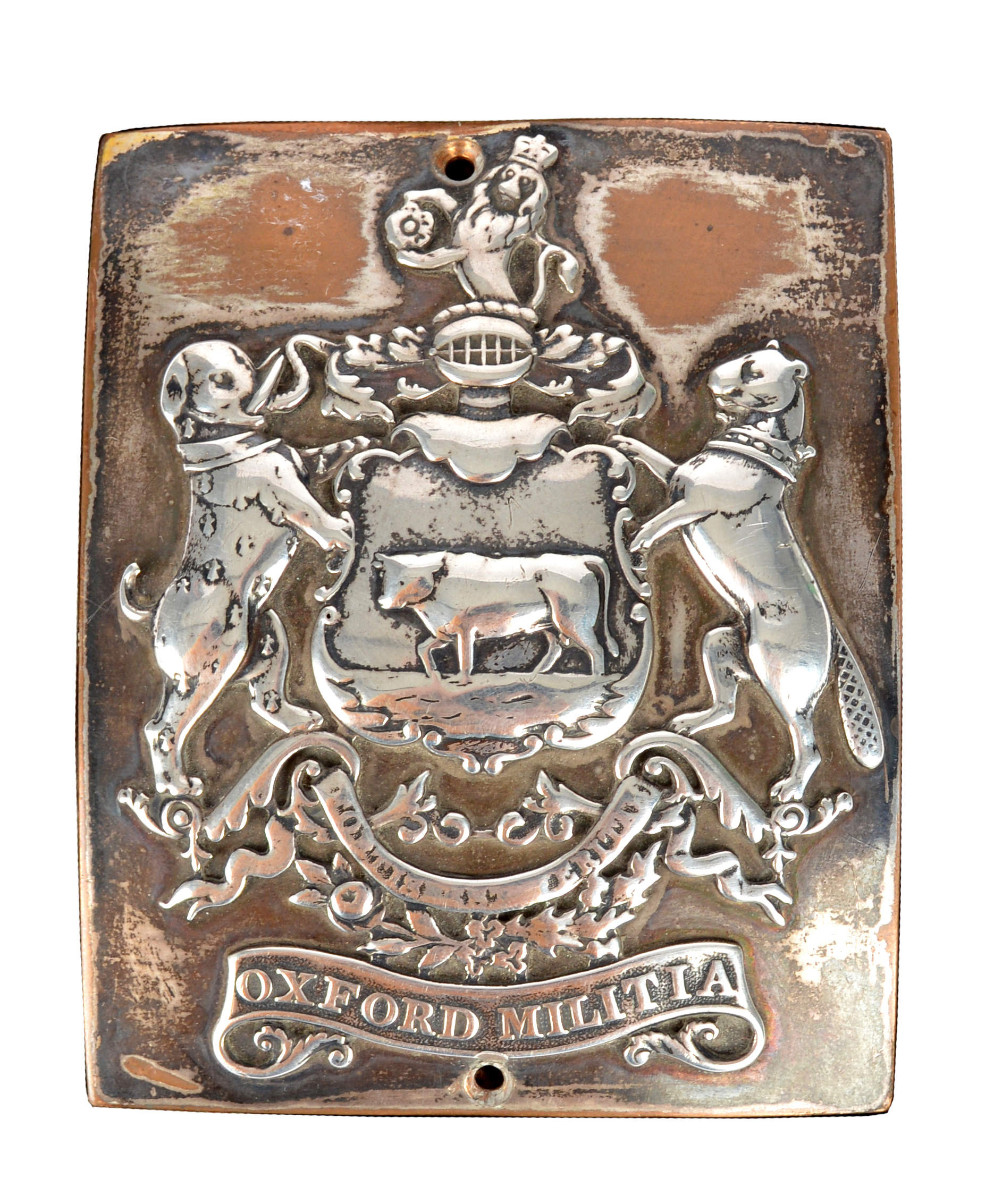 Oxford Militia: a scarce shoulder belt plate, silver plated copper, Oxford arms in relief; an ox fording water supported by an elephant and a beaver, pierced twice for mounting to a wooden base but retaining the original back fittings.