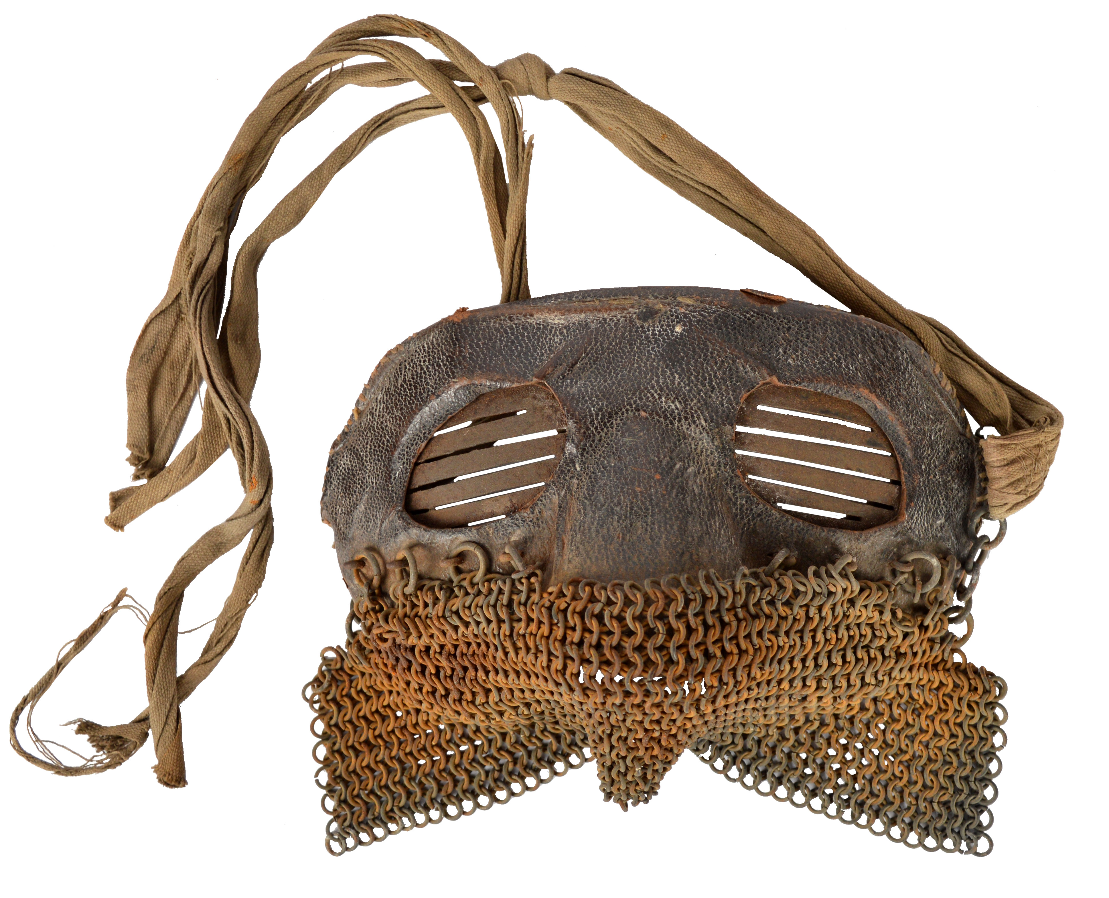 A Great War British tank crew mask, of leather faced steel with slitted viewing panels and suspending a mail skirt to protect the mouth, backed with chamois leather and secured by tapes at the side.