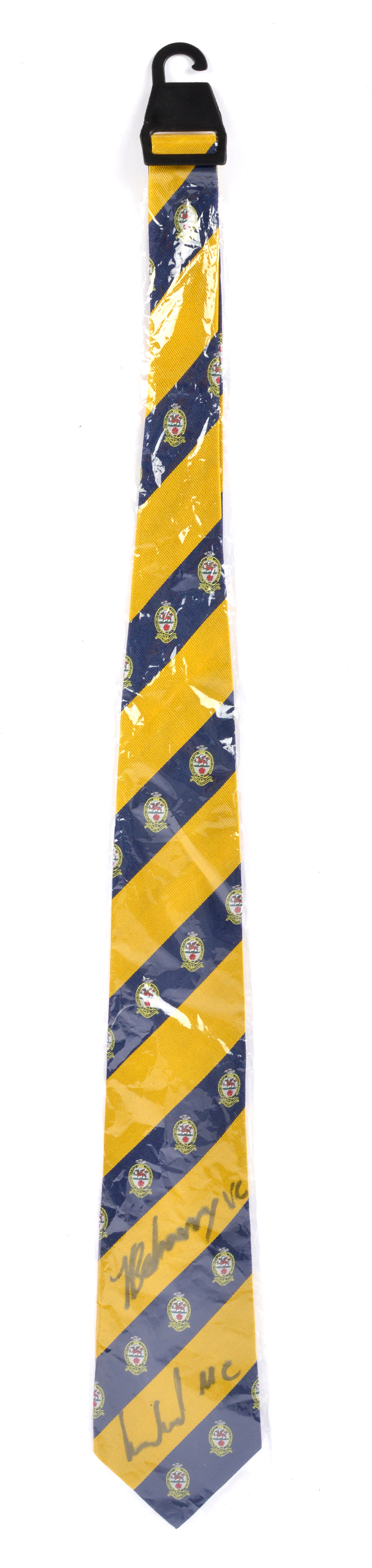 The Princess of Wales Royal Regiment gallantry interest: an autographed regimental association tie, bearing the signatures of gallantry award winners Private Johnson Beharry V.C., and Lance Corporal Brian Wood, M.C.