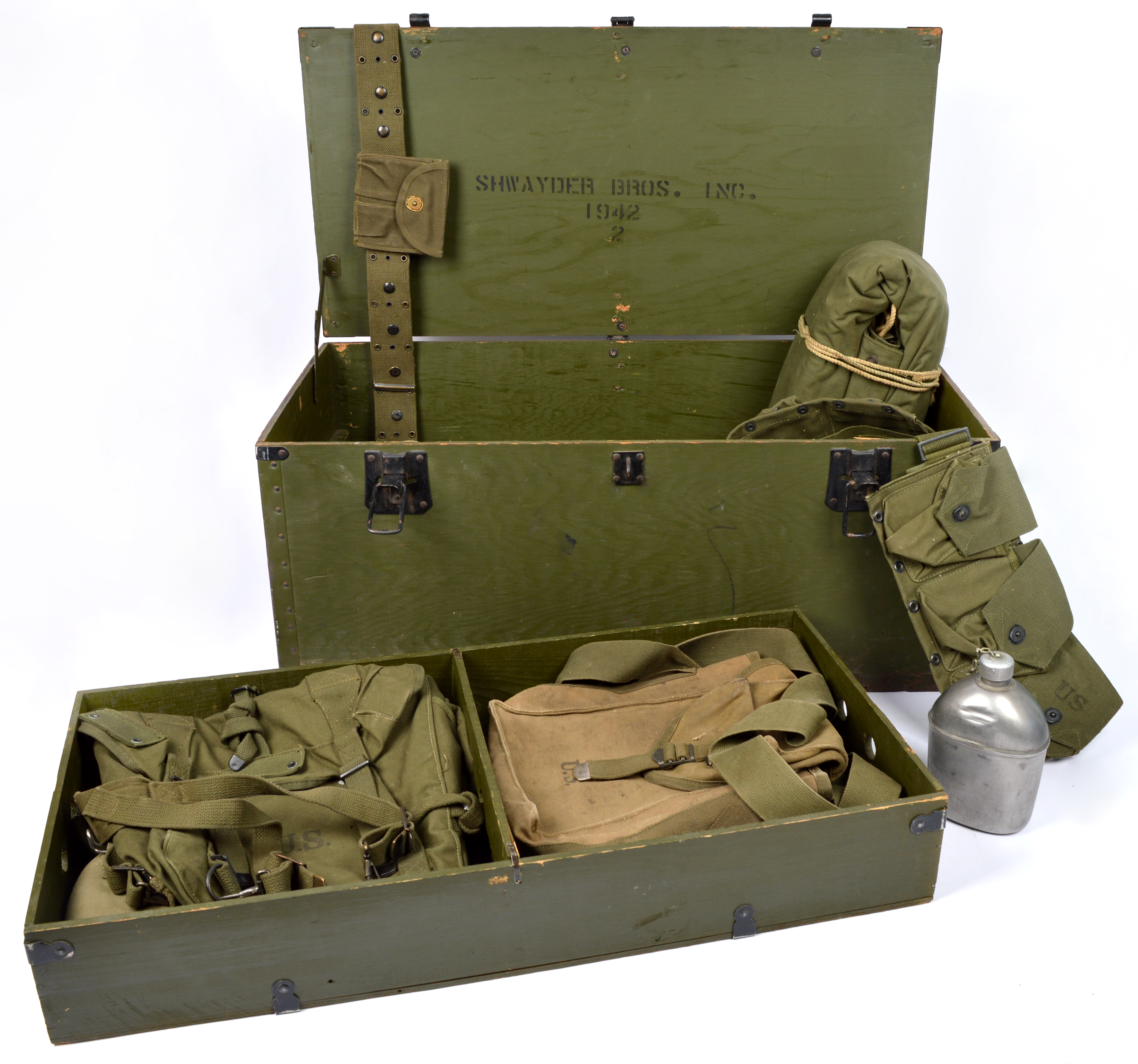 United States of America: a WWII plywood foot locker and assorted contents: plywood box with metal re-enforced edges and corners, removable inner tray, top stencilled 'CAPTAIN EDWARD A. MAHER 0-299589', inside of lid 'SHWAYDER BROS. INC. 1942 2'; contents including water bottle, mess kit, ammunition pouches, webbing equipment, various eras but much post-war.