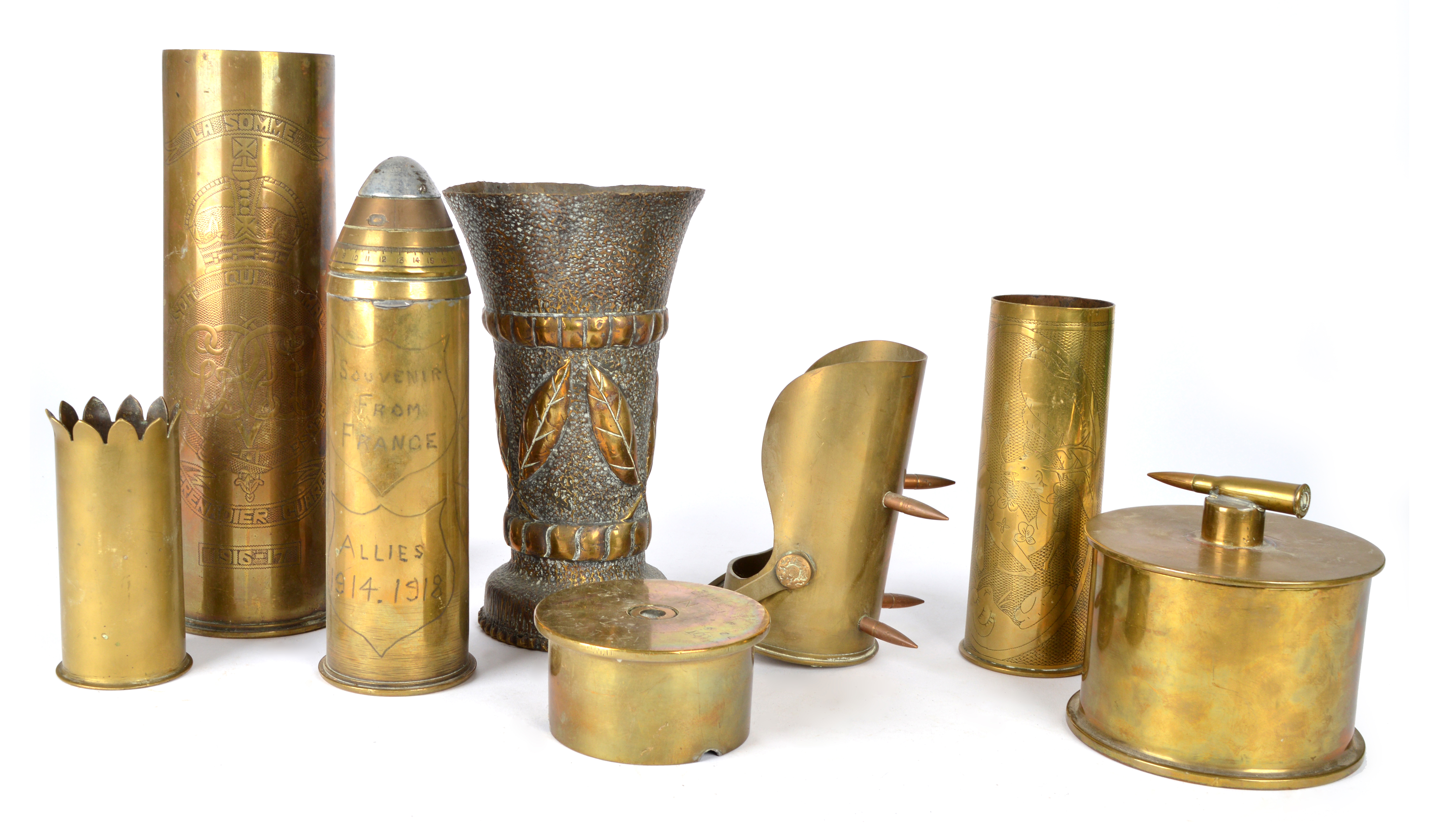 A large quantity of 'trench art', formed from artillery ordnance relics, and including: vases, tobbaco jars, ashtrays, match box holders and candlesticks; fashioned from a variety of Great War and later shell cases and inert ammunition. [qty]