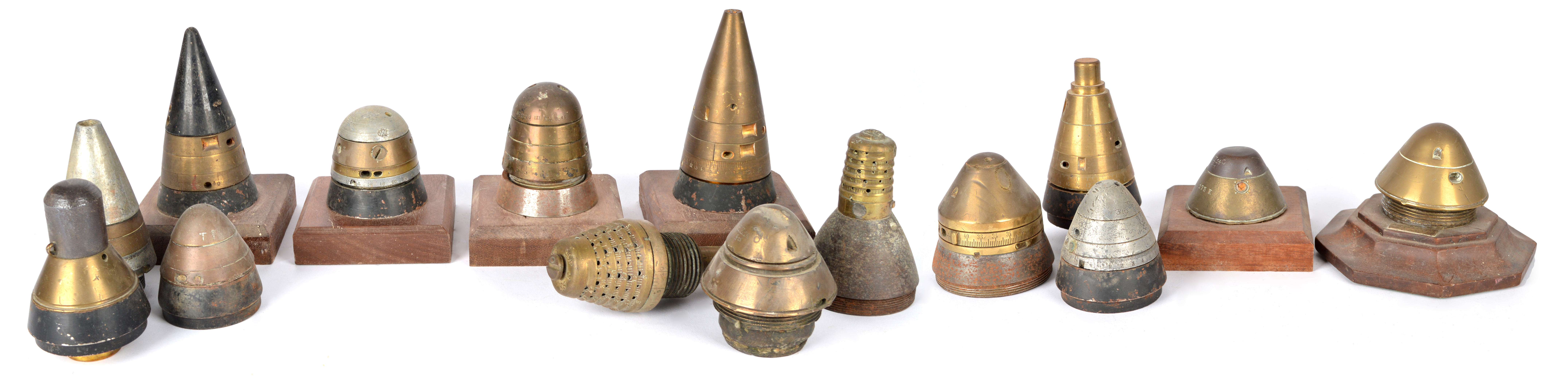 A large collection of inert artillery shell fuses, various nations and eras but including many World War One examples, includes French 'beehive' types. [approx 54]