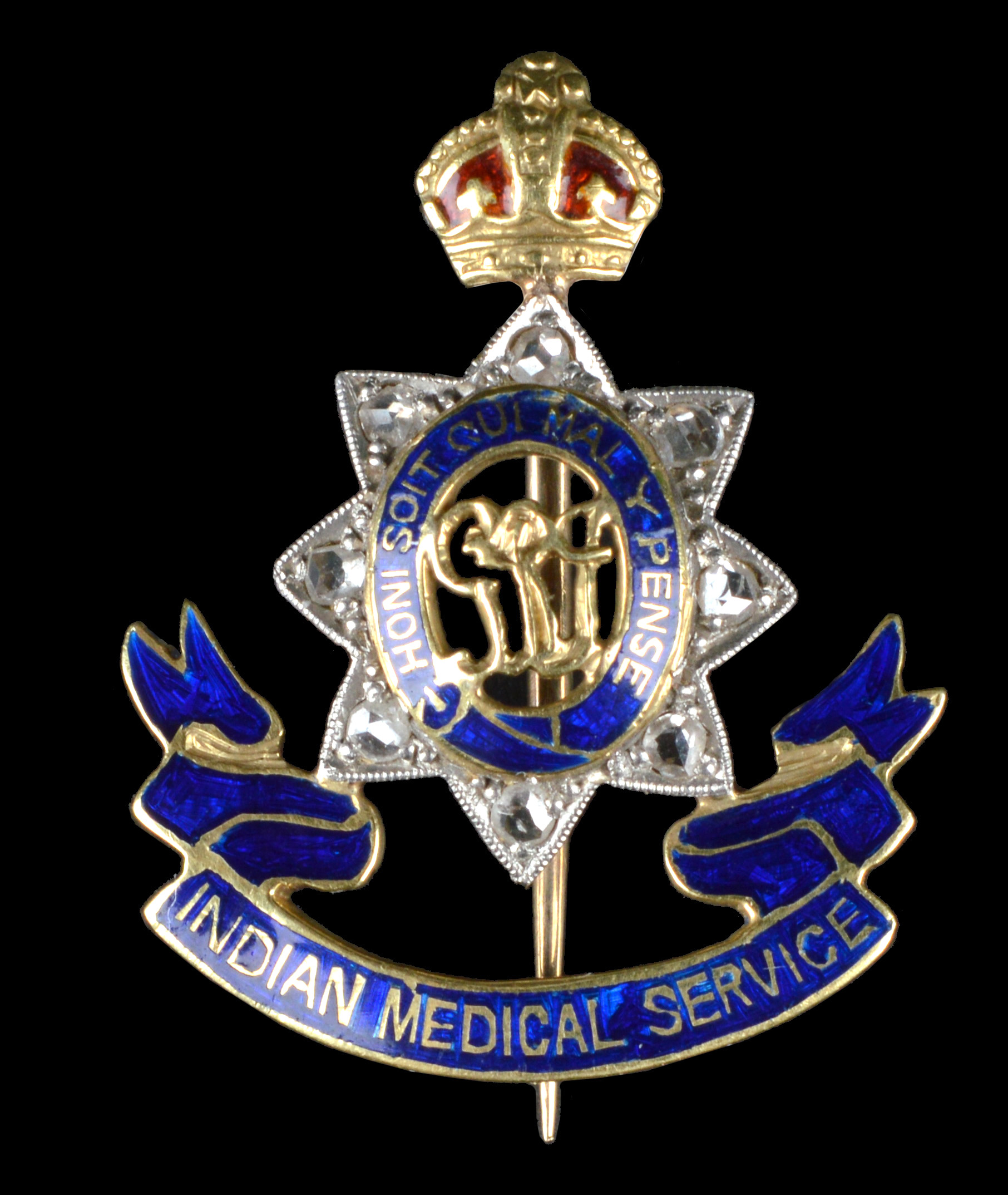 A very fine Indian Medical Service sweetheart brooch, the scroll, garter and crown enamelled; the star set with white stones; reverse stamped '15CT' and 'PT'.