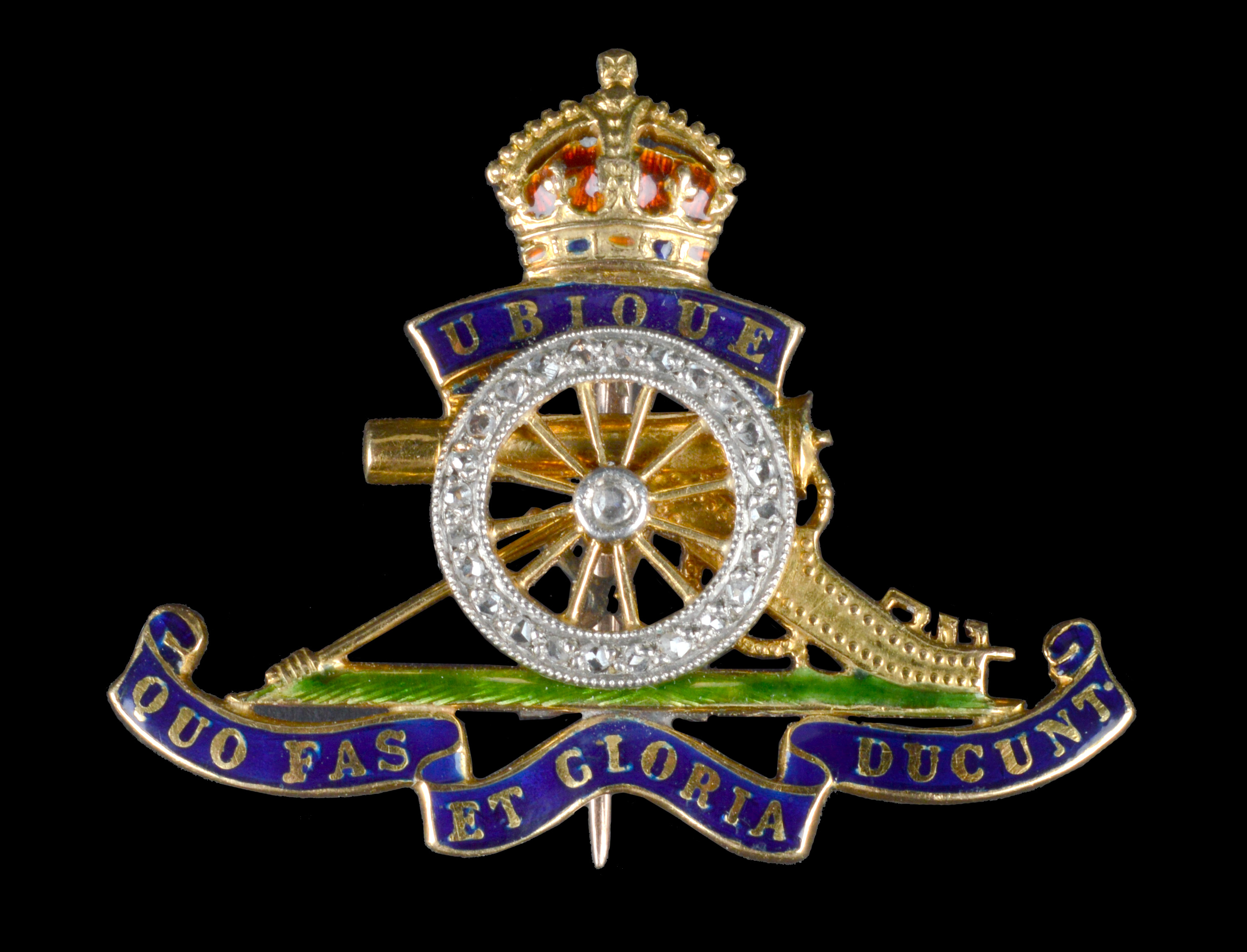 A very fine Royal Artillery sweetheart brooch, enamelled crown and scrolls, gun carriage with rotating wheel set with white stones, stamped '18'.