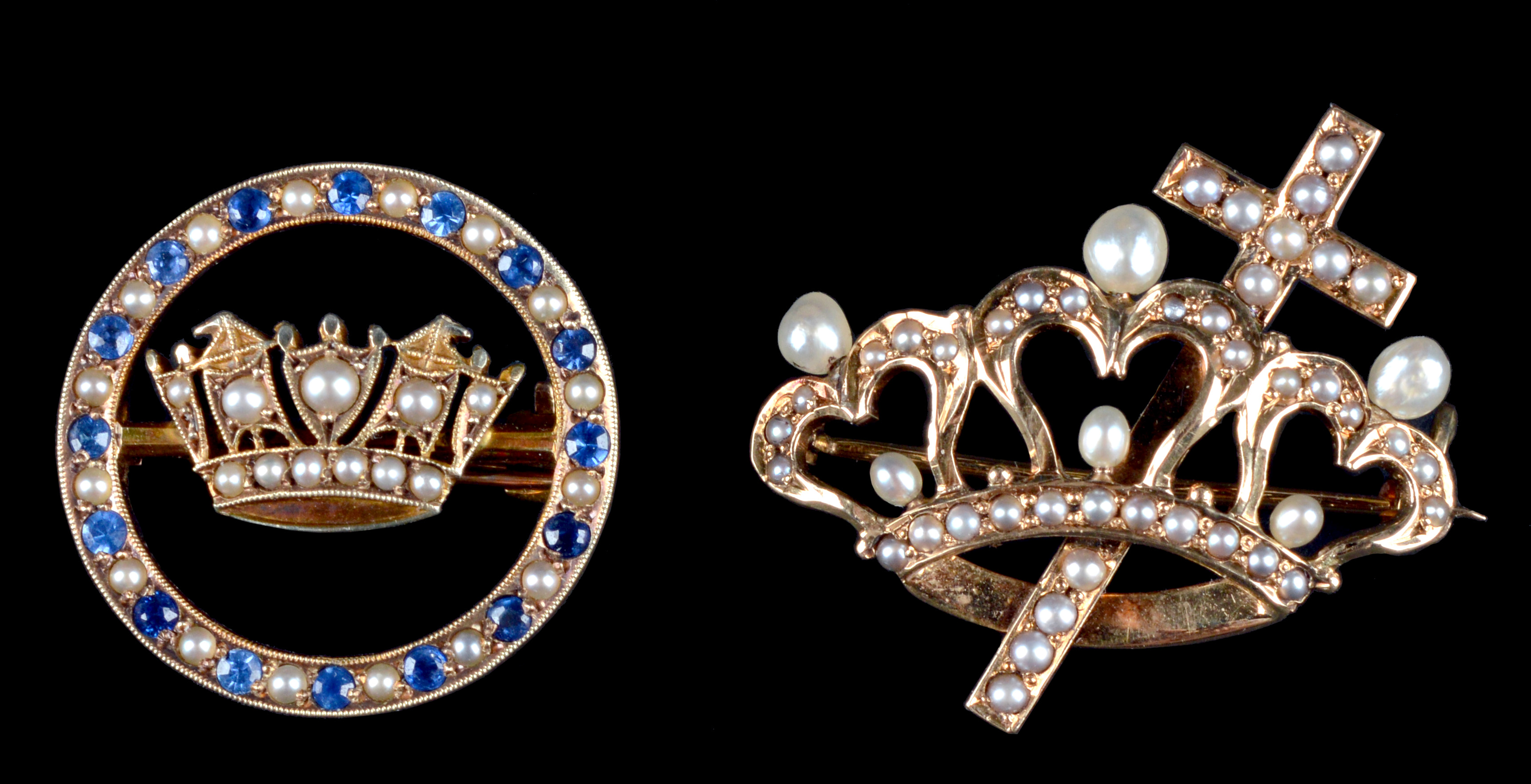 A fine nine carat gold Naval sweetheart brooch, seed pearl-set Naval crown within a seed pearl and blue stone-set circlet, Birmingham 1965; together with a seed pearl-set brooch in the form of a coronet transfixed by a cross, stamped '14'. [2]