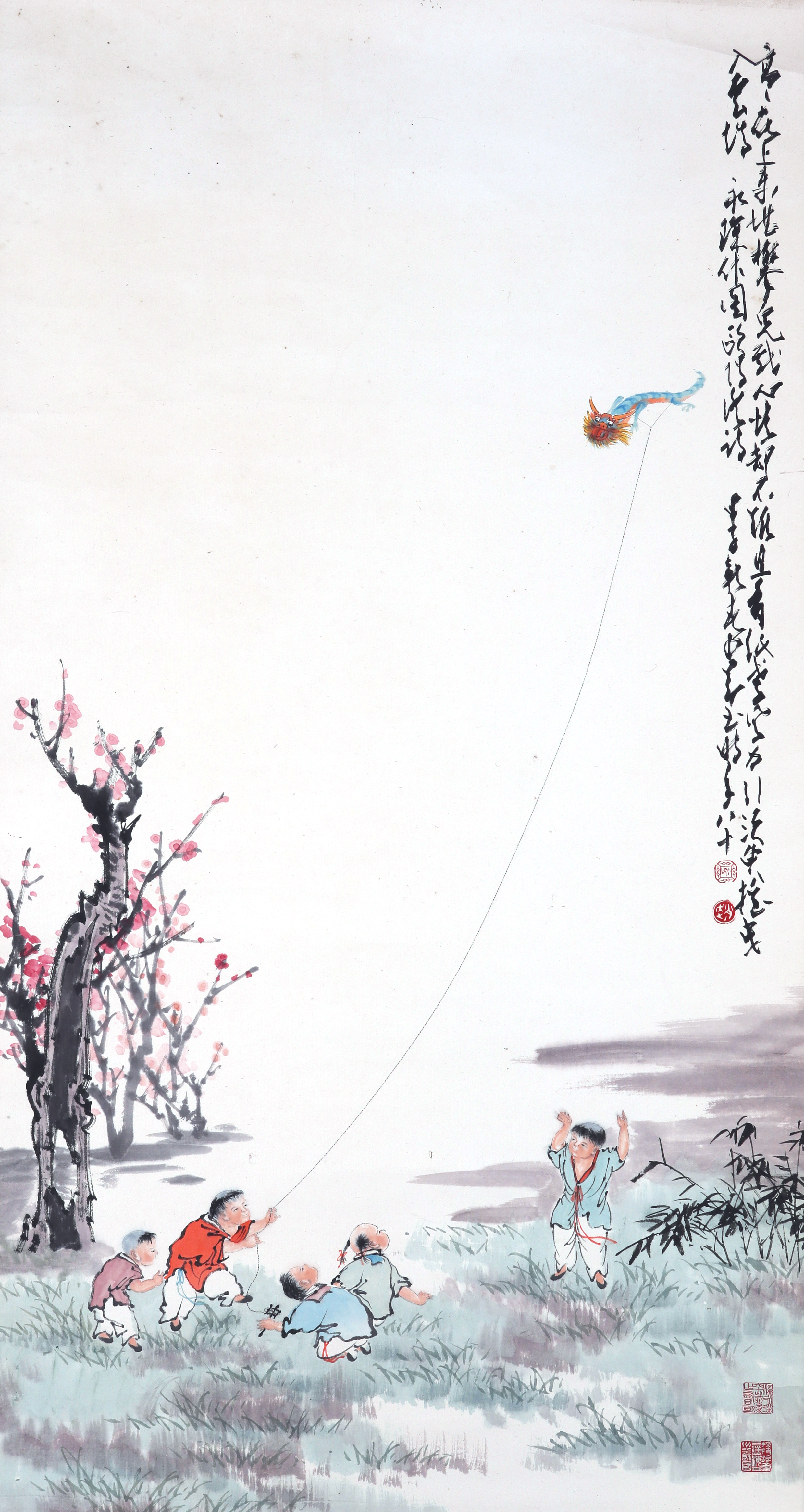 WEN YONG CHEN (WAN WING SUM 1922-1995) CHILDREN FLYING A KITE A Chinese scroll painting