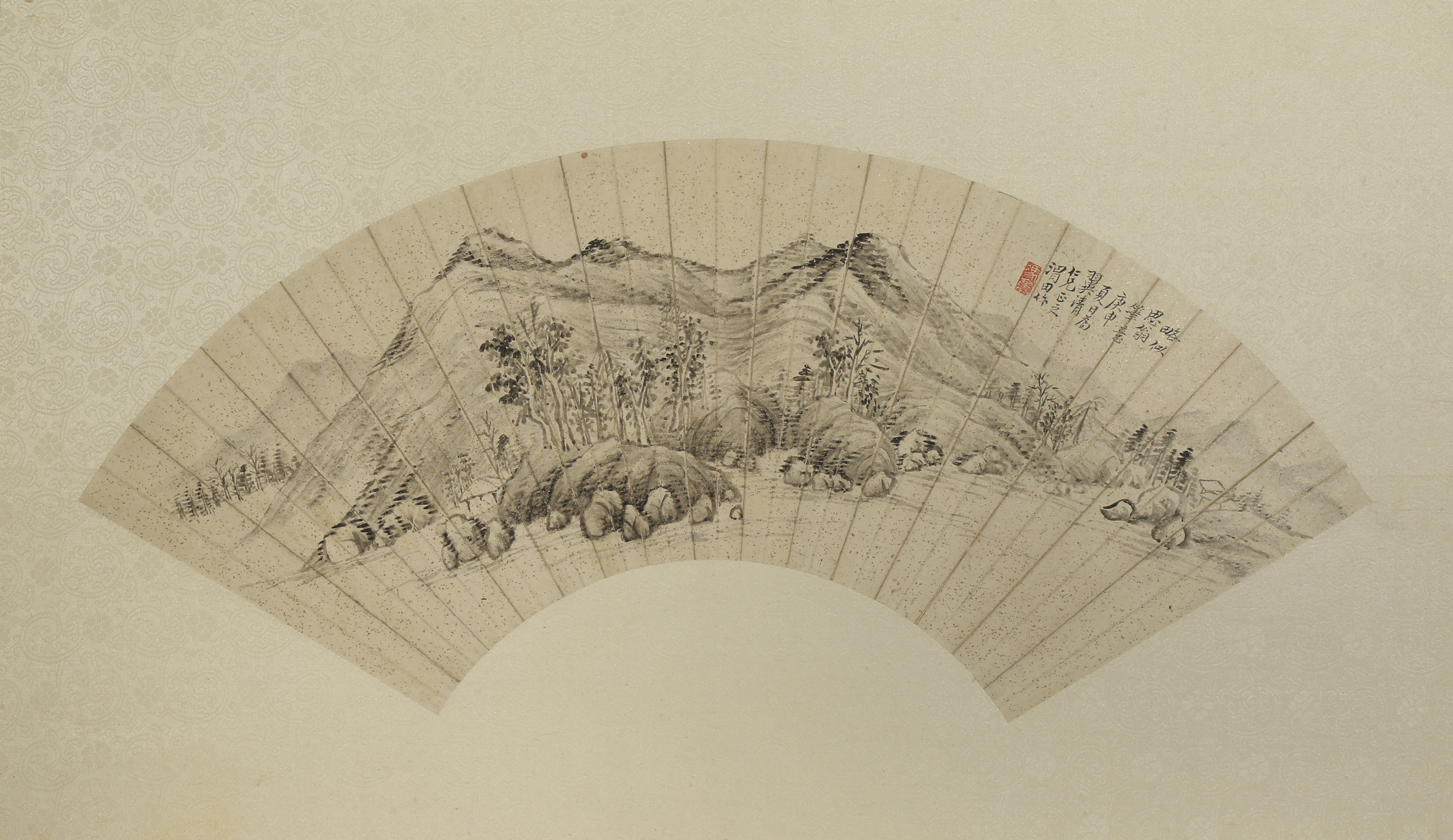 GU LUO (1763-1837) A LADY PUTTING ON MAKEUP IN THE STYLE OF TANG YING A Chinese fan leaf painting