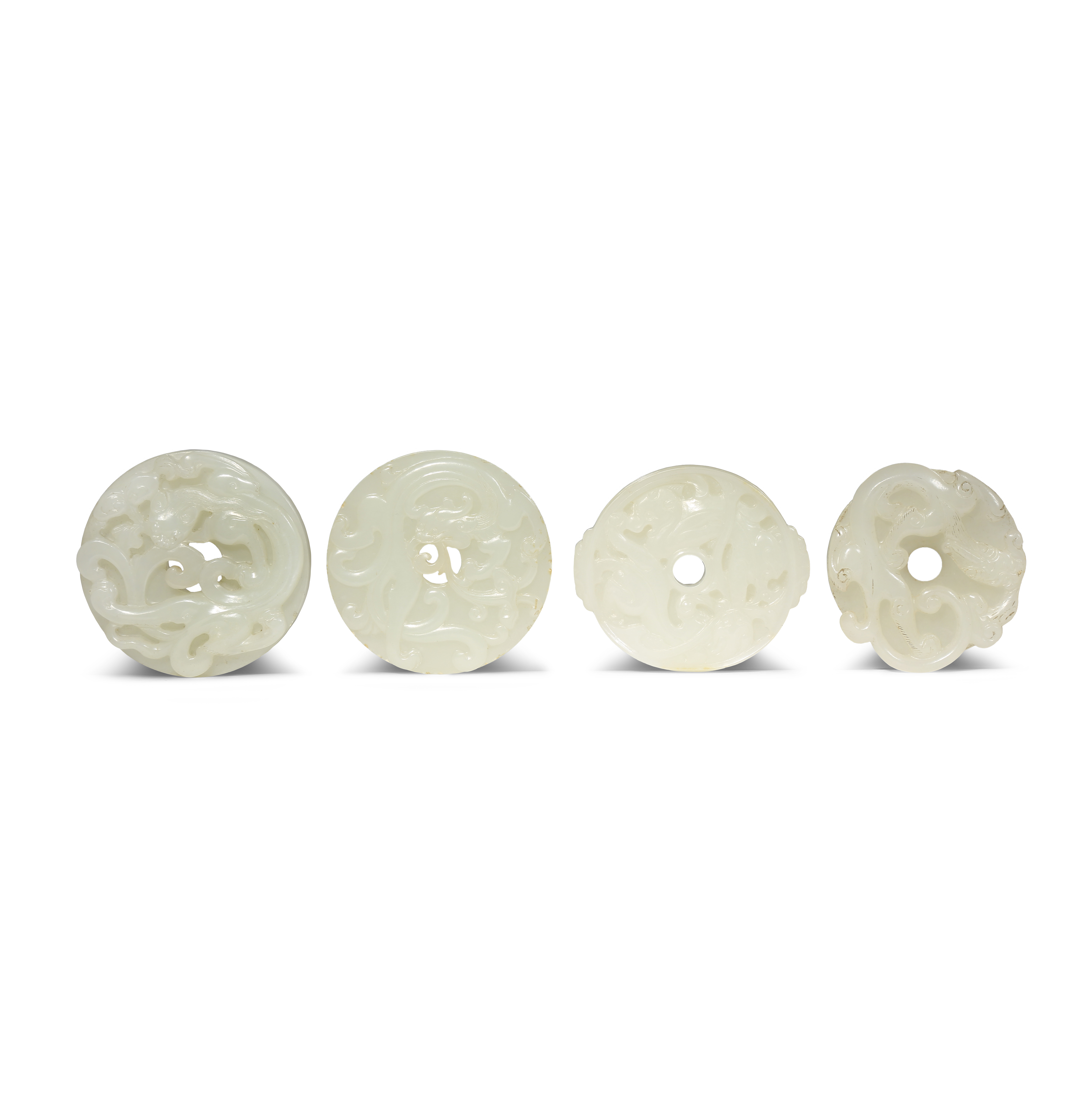 Three pale celadon and one white jade, each formed as a bi disc and carved in relief with sinuous chilong holding lingzhi, the undersides decorated with archaistic designs, 5.7cm. (4)