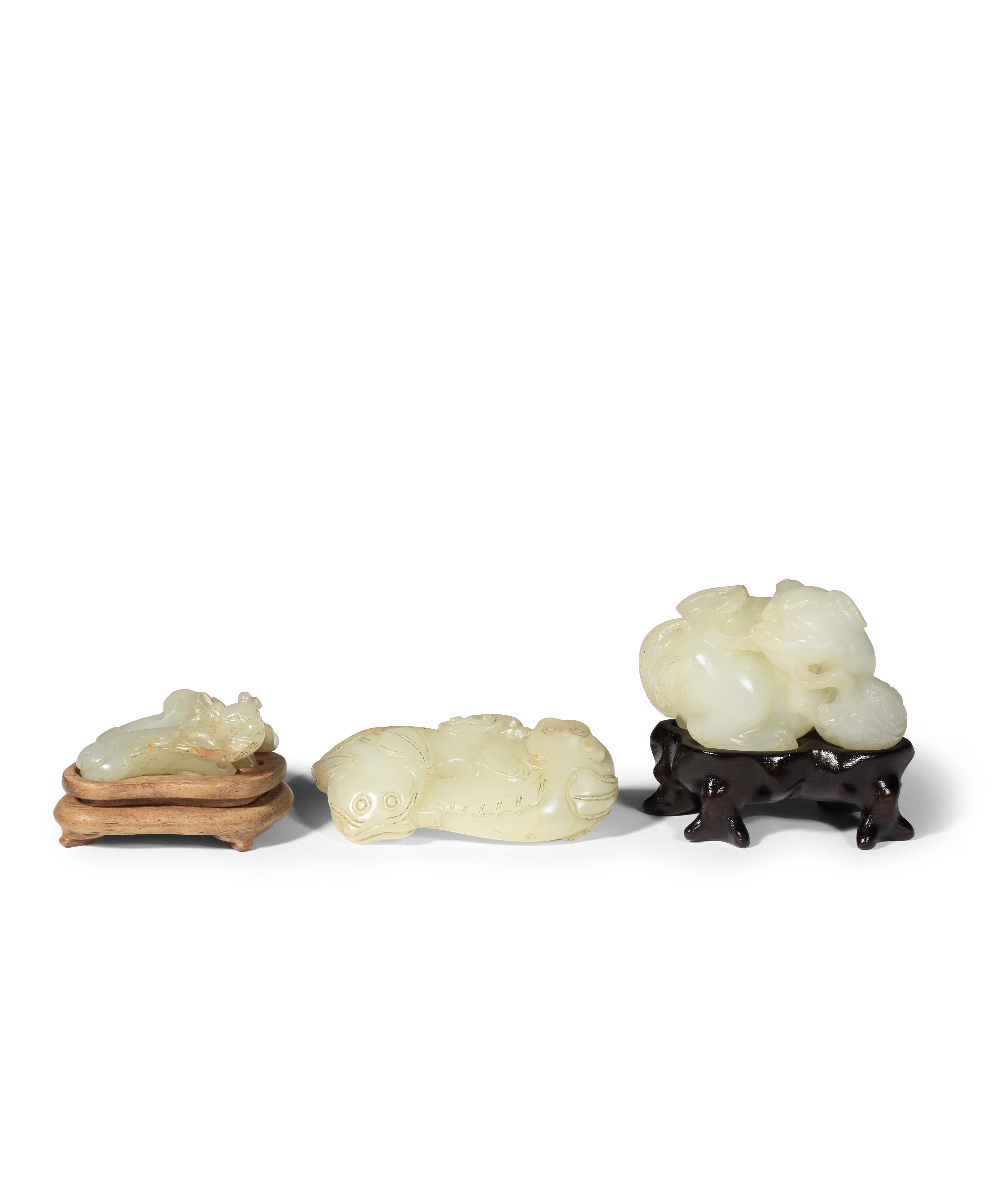 THREE CHINESE PALE CELADON JADE CARVINGS QING DYNASTY One depicting a lion dog playing with a...