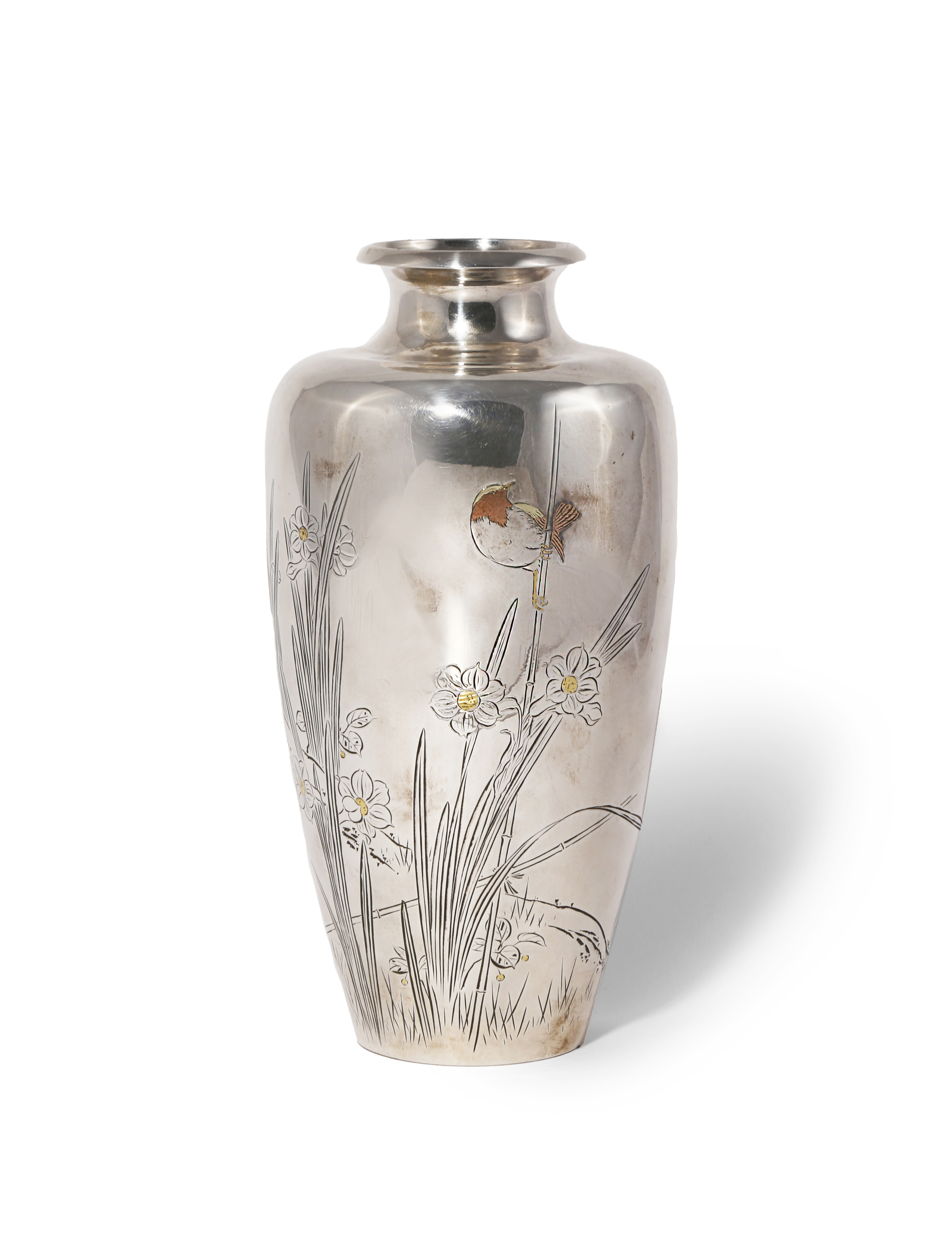 The baluster body with a short everted rim, decorated with a small bird perched on a stem of bamboo and surrounded by daffodils, Nihon Suisen, with details highlighted in gilt and copper, signed Yoshin koku to the side and the base with punch marks for jungin (pure silver) and a swallow in flight used by the factory of Hattori Kintaro (1860-1934), 18.2cm.