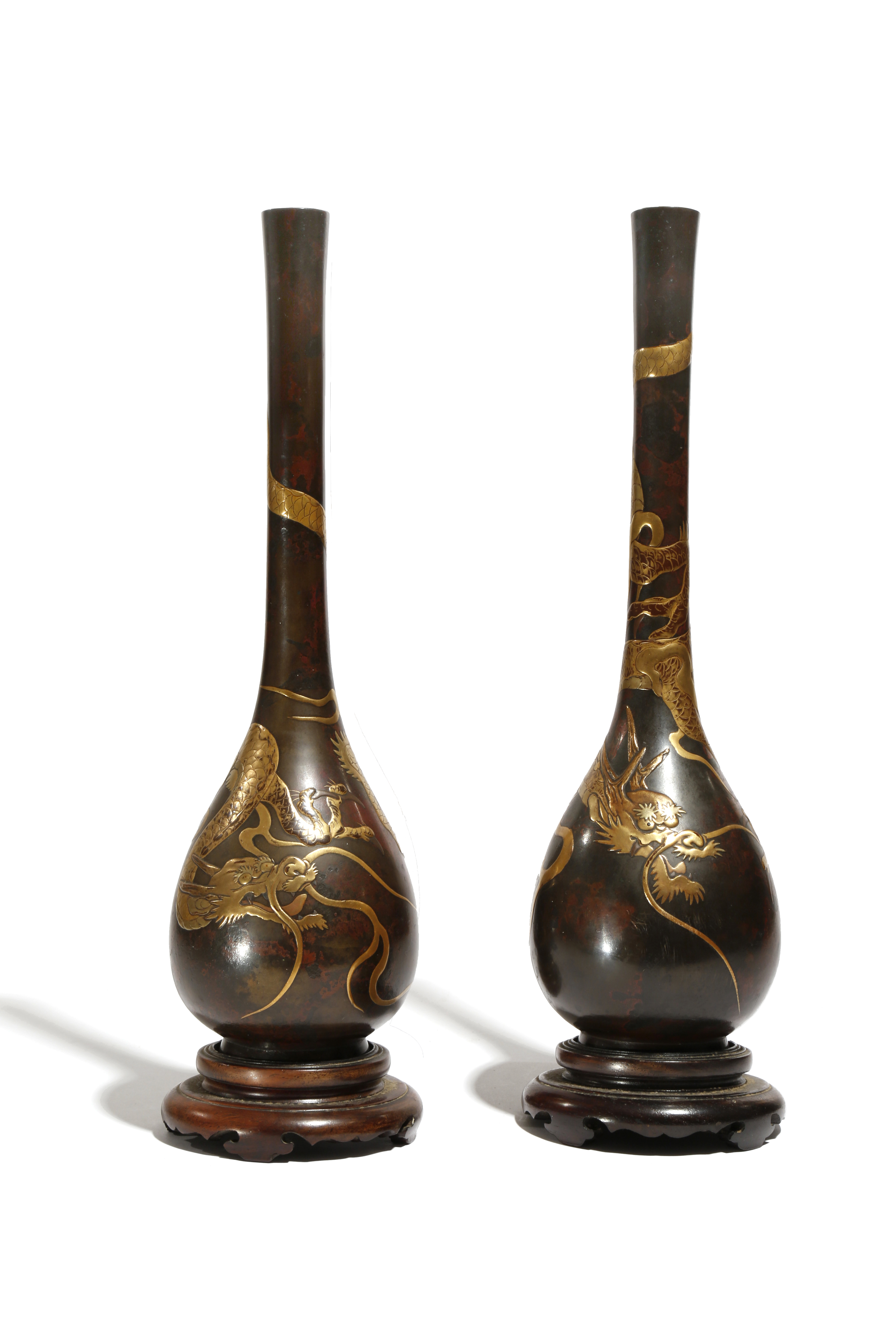 The tall pear-shaped bodies with an elongated neck and a short flaring foot, both decorated with a writhing dragon amongst flaming wisps in gold lacquer on a reddish-brown ground, both unsigned, together with wood stands, 29.8cm. (4)
