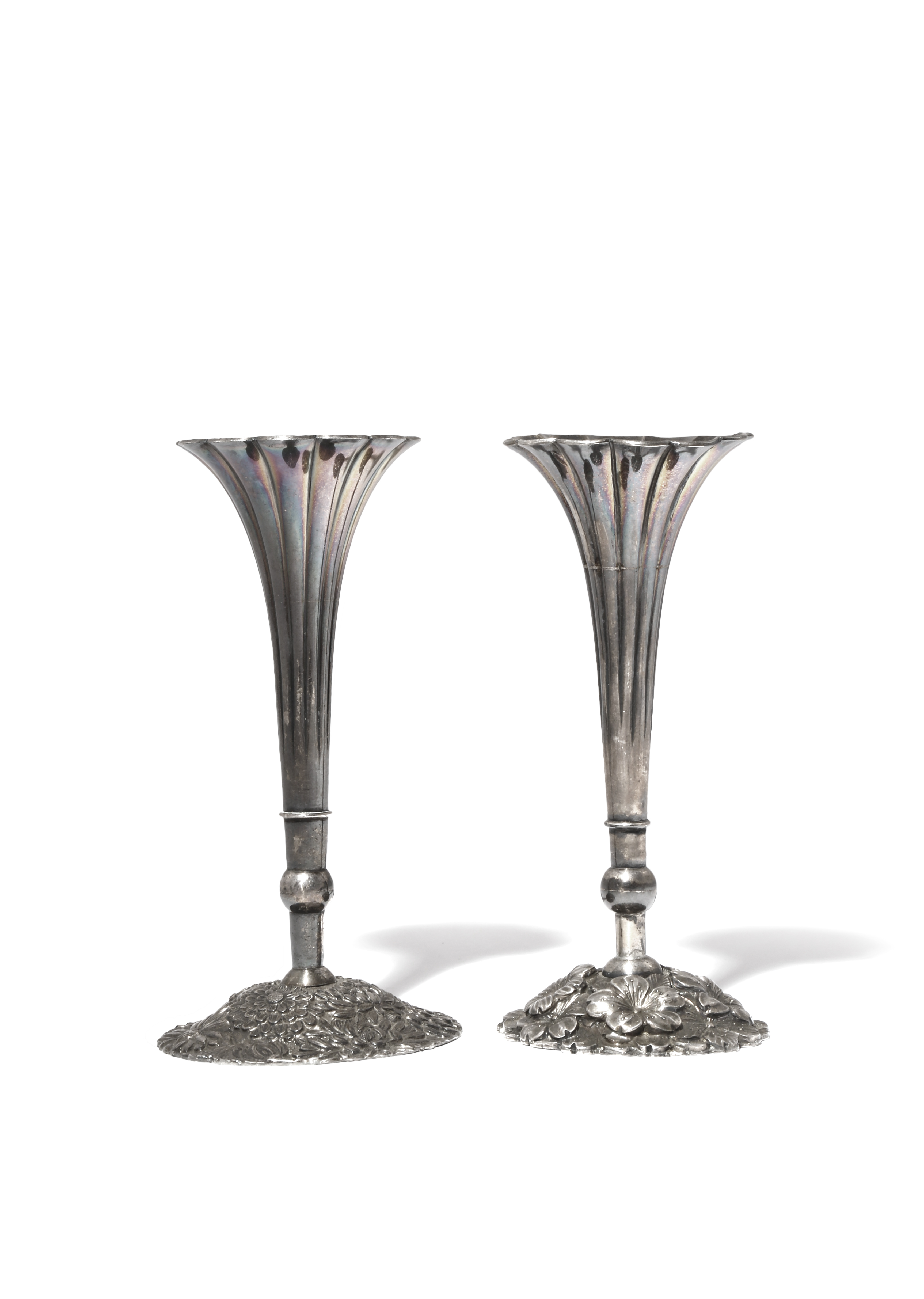 Both with a tall fluted body raised on a large circular base, one decorated with chrysanthemum flowerheads, the other with prunus blossoms, both marked Konoike zo for Konoike of Yohama, and jungin (pure silver), 13.5cm. (2)