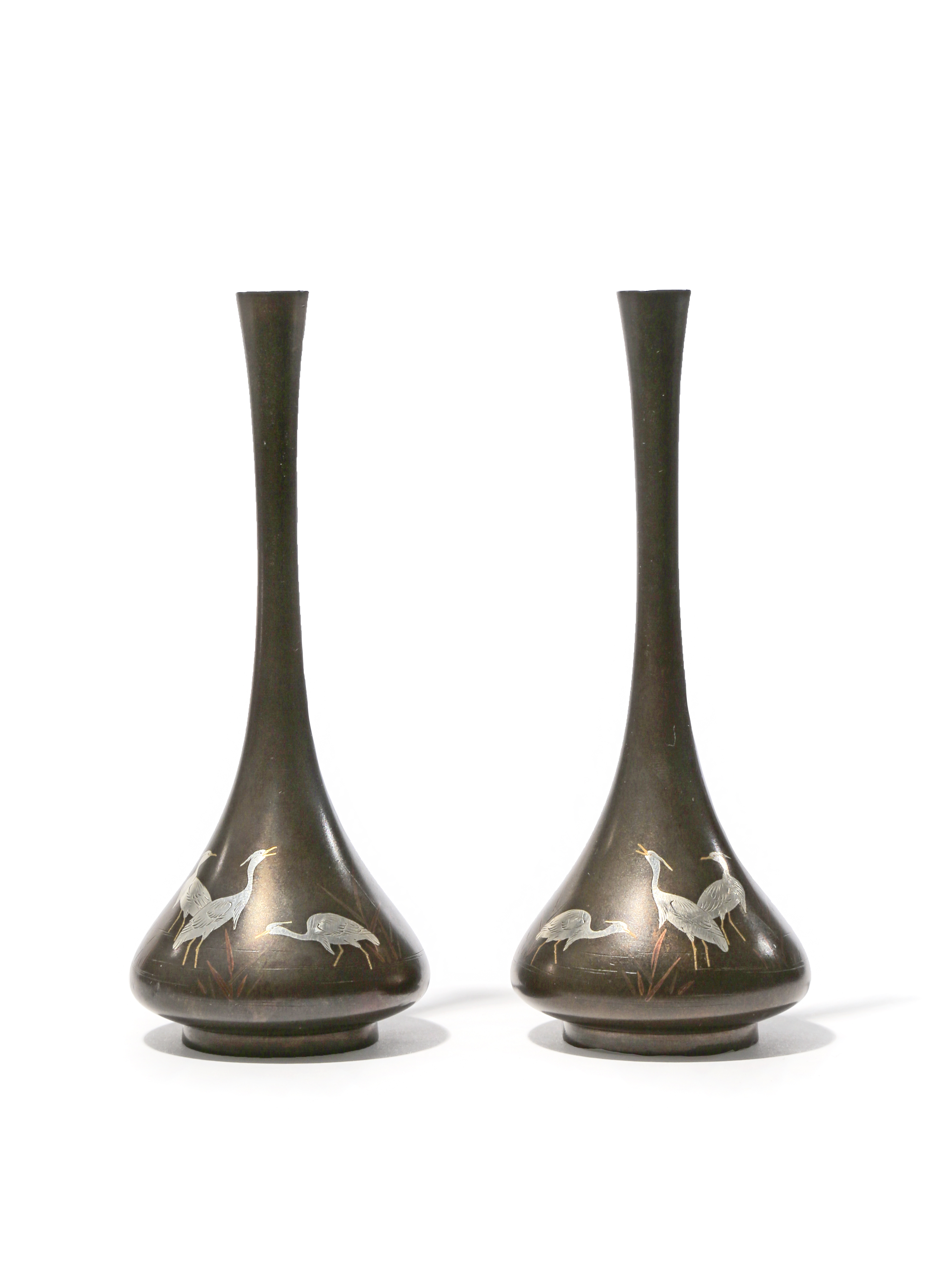 The tall pear-shaped bodies each decorated with three egrets inlaid in silver, gold, shibuichi and shakudo, the birds standing in a stream with tall grasses around them, the sides signed Mitsunobu and the bases marked Kyoto Kuroda zo, 13cm. (2)