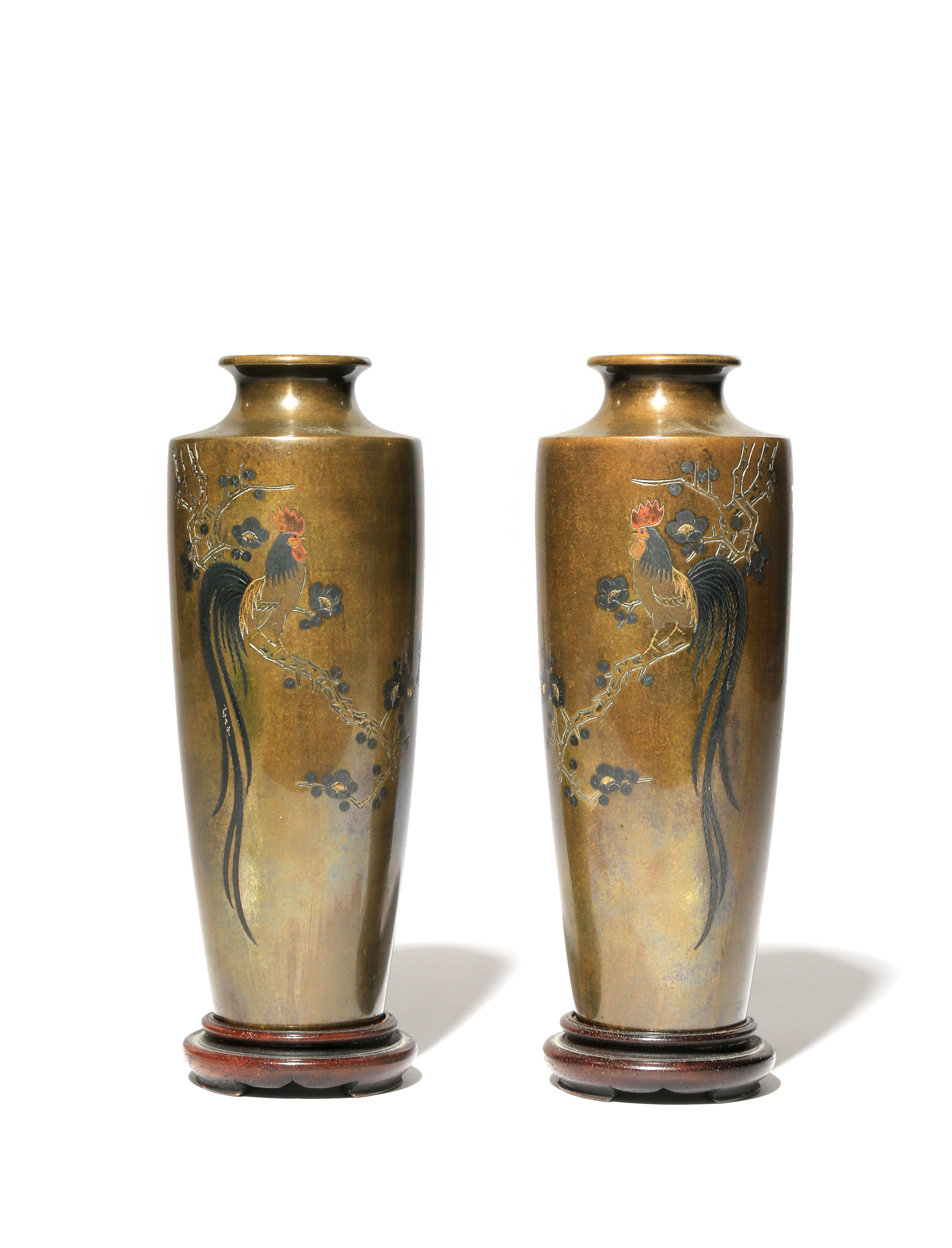 Both decorated with an onagadori (long-tailed cockerel) perched on a flowering branch of prunus, with details inlaid in silver, gilt, copper and shibuichi honzogan, the designs mirroring each other, both with a three character signature to the side reading Mitsufune koku, together with wood stands, the vases 15.3cm. (4)