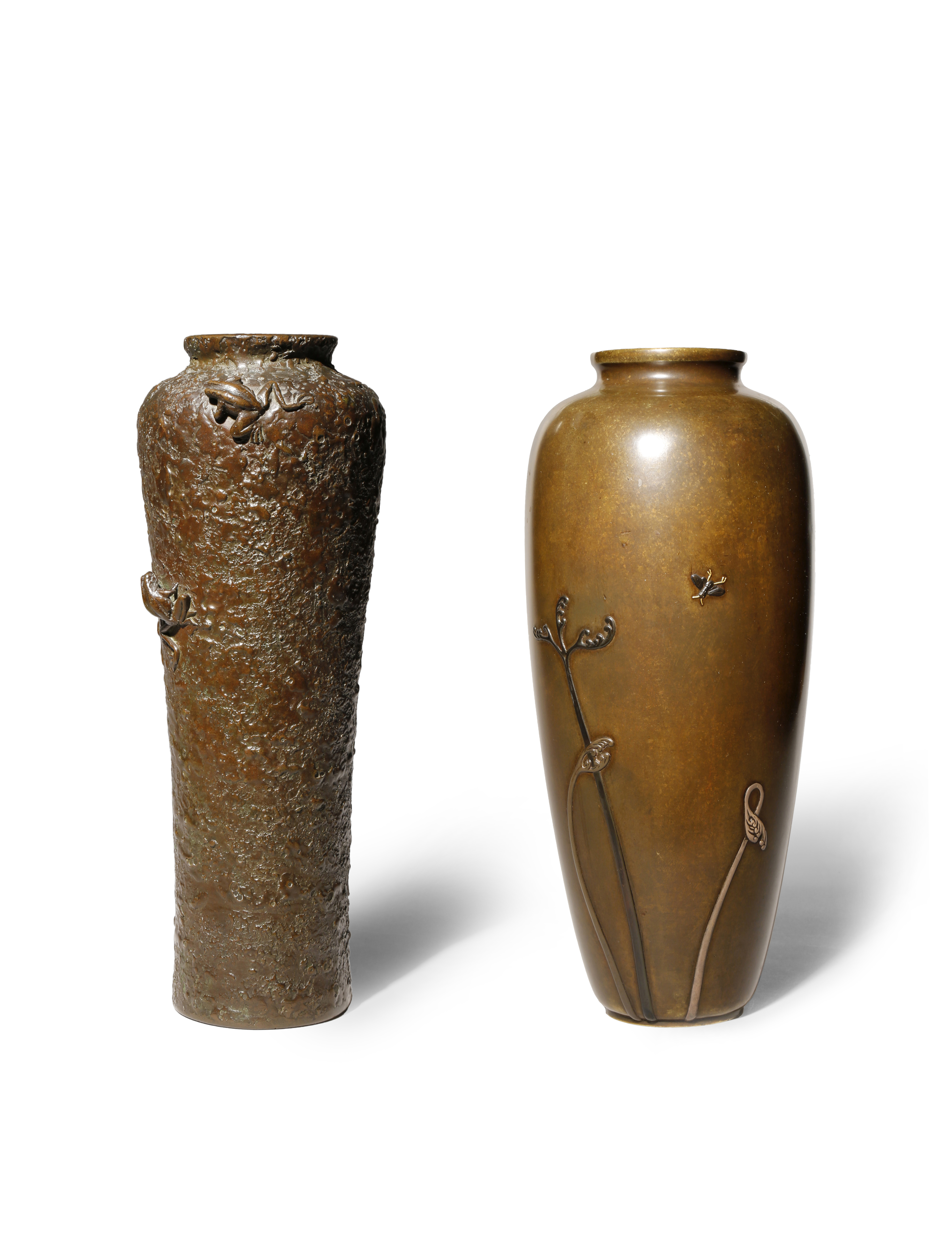 TWO JAPANESE BRONZE IKEBANA VASES MEIJI/TAISHO PERIODS Both with tall slender bodies